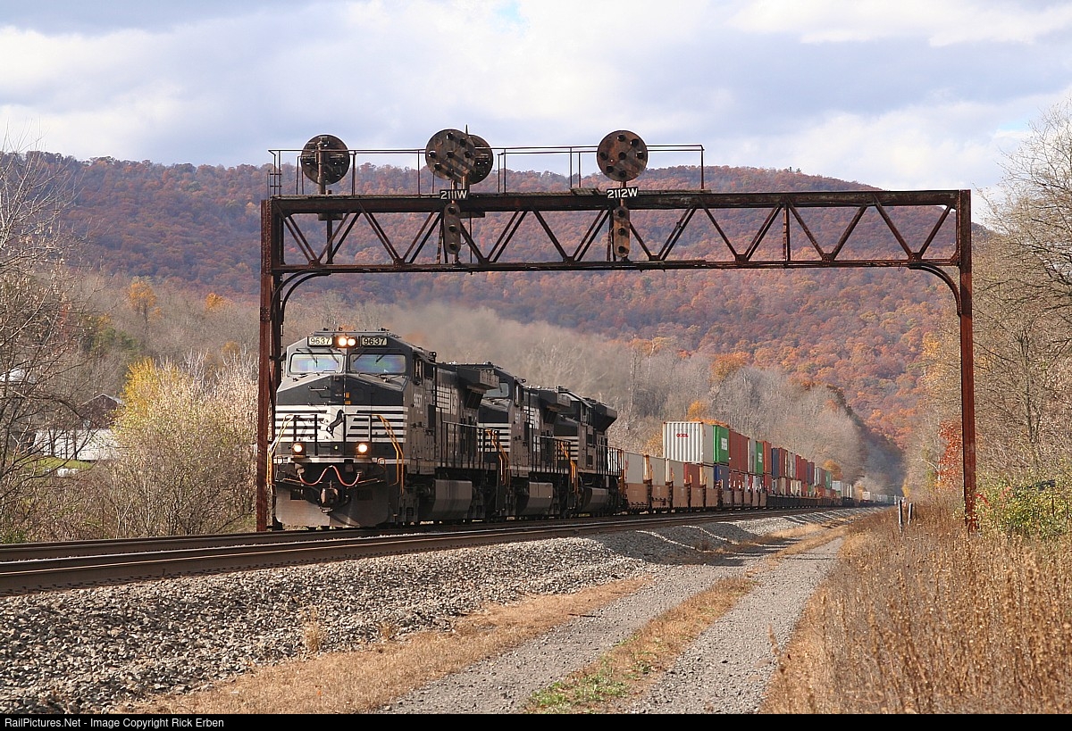An eastbound intermodal consist led by NS 9637 arrives for its portrait beneath the MP 211 signal bridge just east of Barree, PA. The crisp air, entrancing colors of the mountain slopes and a moody sky casting shadows across the autumn landscape combine with the atmosphere of the railroad to make this a sublime setting.