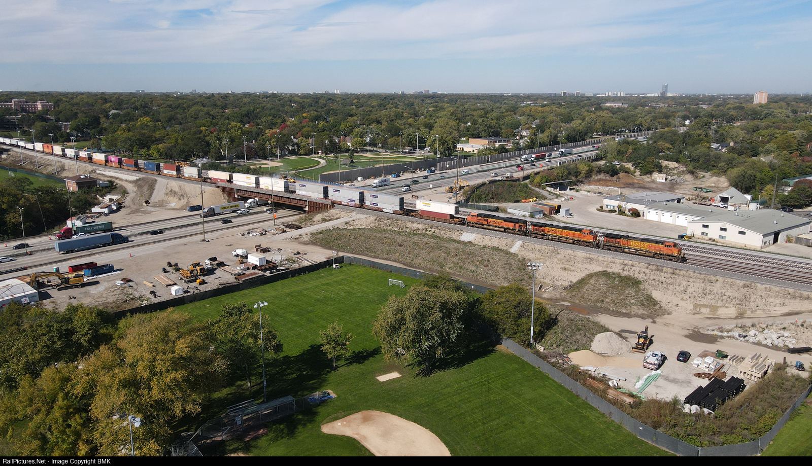 An eastbound stack train rolls through the massive construction zone over the Tri-State Tollway.