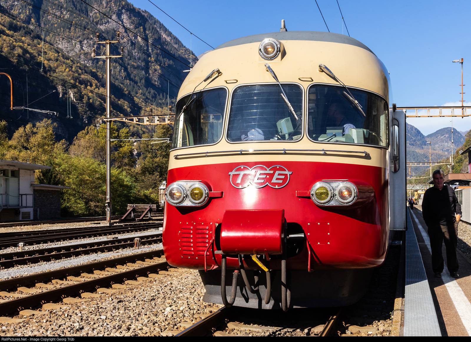 SBB Historic's timelessly elegant TRANS EUROP EXPRESS multiple unit RAe TEE II # 1053, built in 1961 and now 60 years old, recently reached Bodio in the Ticino on its journey for patrons (Gönnerclub RAe TEE II 1053) from Olten via Arth Goldau-Erstfeld-Gotthard mountain line. Here, locomotive Re 4/4 II # 11195 was precoupled to pull the train set over the section til Bellinzona, with ETCS L2 train protection, which is missing on this vehicle.