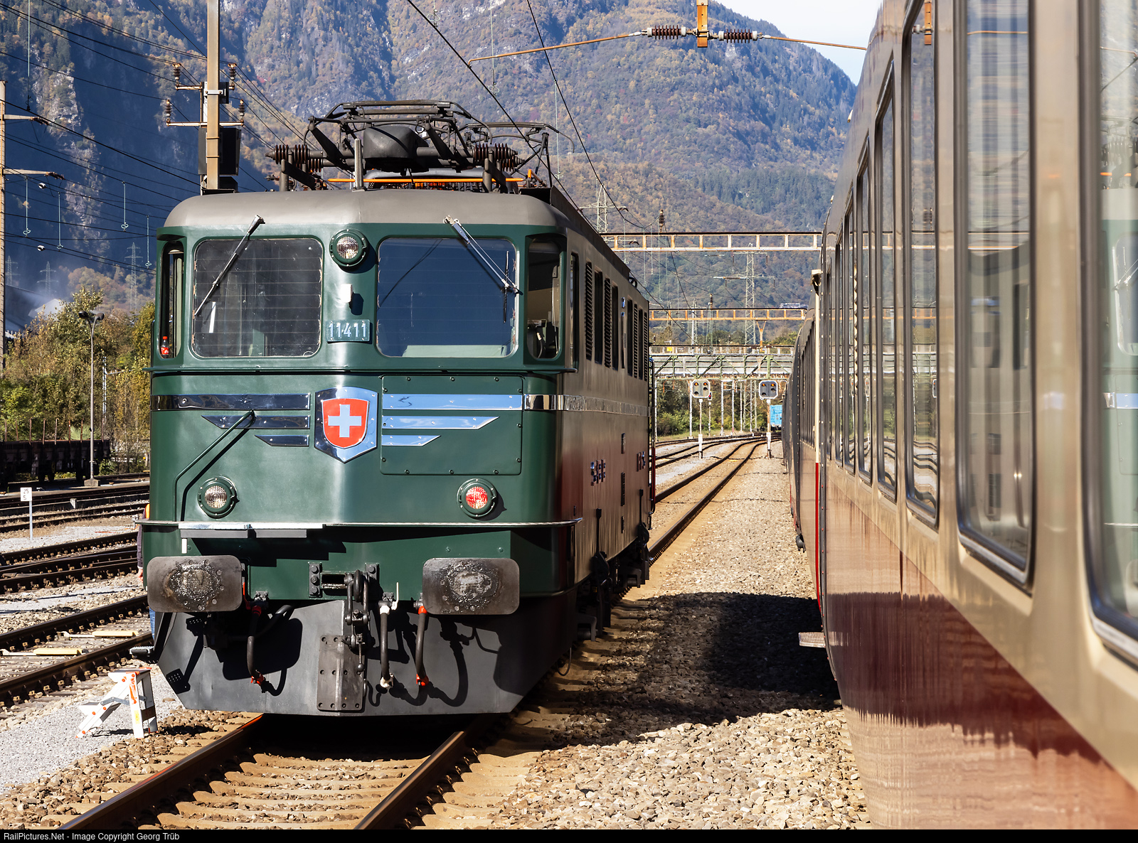 Ae 6/6 # 11411 "Zug" of SBB Historic, based in Erstfeld, recently reached Bodio, with a trip for cab ride over the Gotthard mountain line. The photo was taken out of the open door of the RAe TEE II # 1053 trainset of SBB Historic, which was on the journey for patrons from Olten to Bellinzona, and stopped for coupling locomotive Re 4/4 II # 11195 in front til Bellinzona.