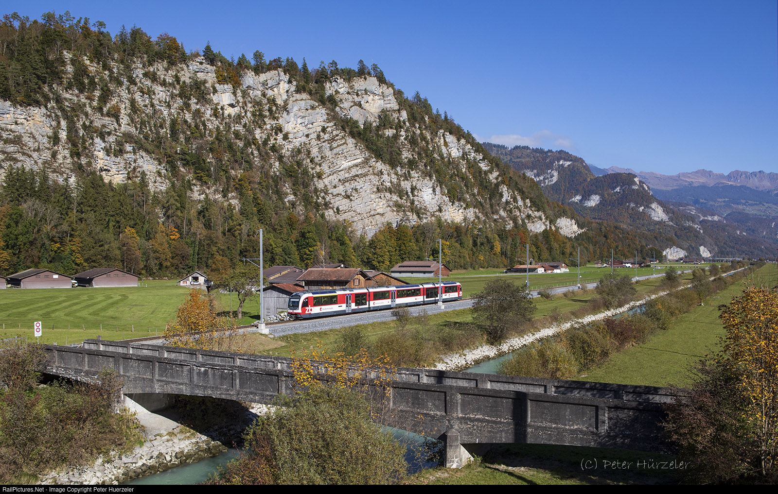 | On a beautiful fall day ABeh 161 012 is runing as regional train R9876 through the Aare valley at Brienz. The street towards Axalp once crossed the river by this concrete bridge bevor a newer one was built were I'm standing on. |