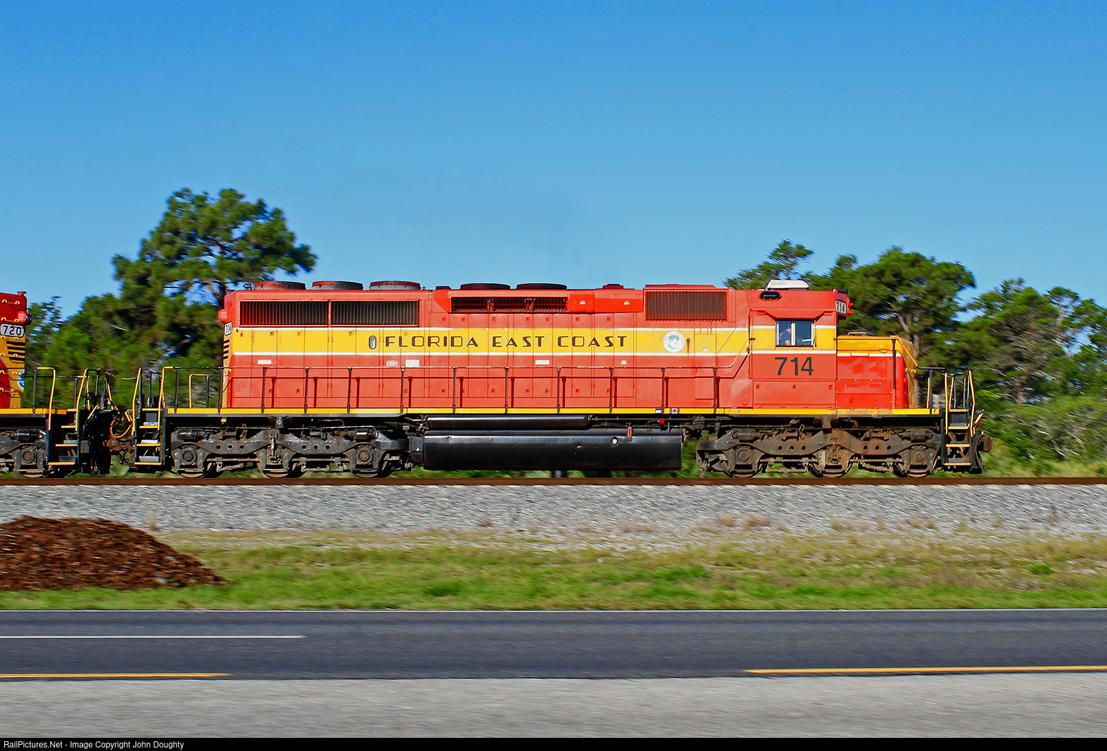 | FEC 714 leads the FEC 336 rock train north through Rockledge, Florida. This was the very first engine to be painted into the FEC Champion paint scheme, and it still looks great. |