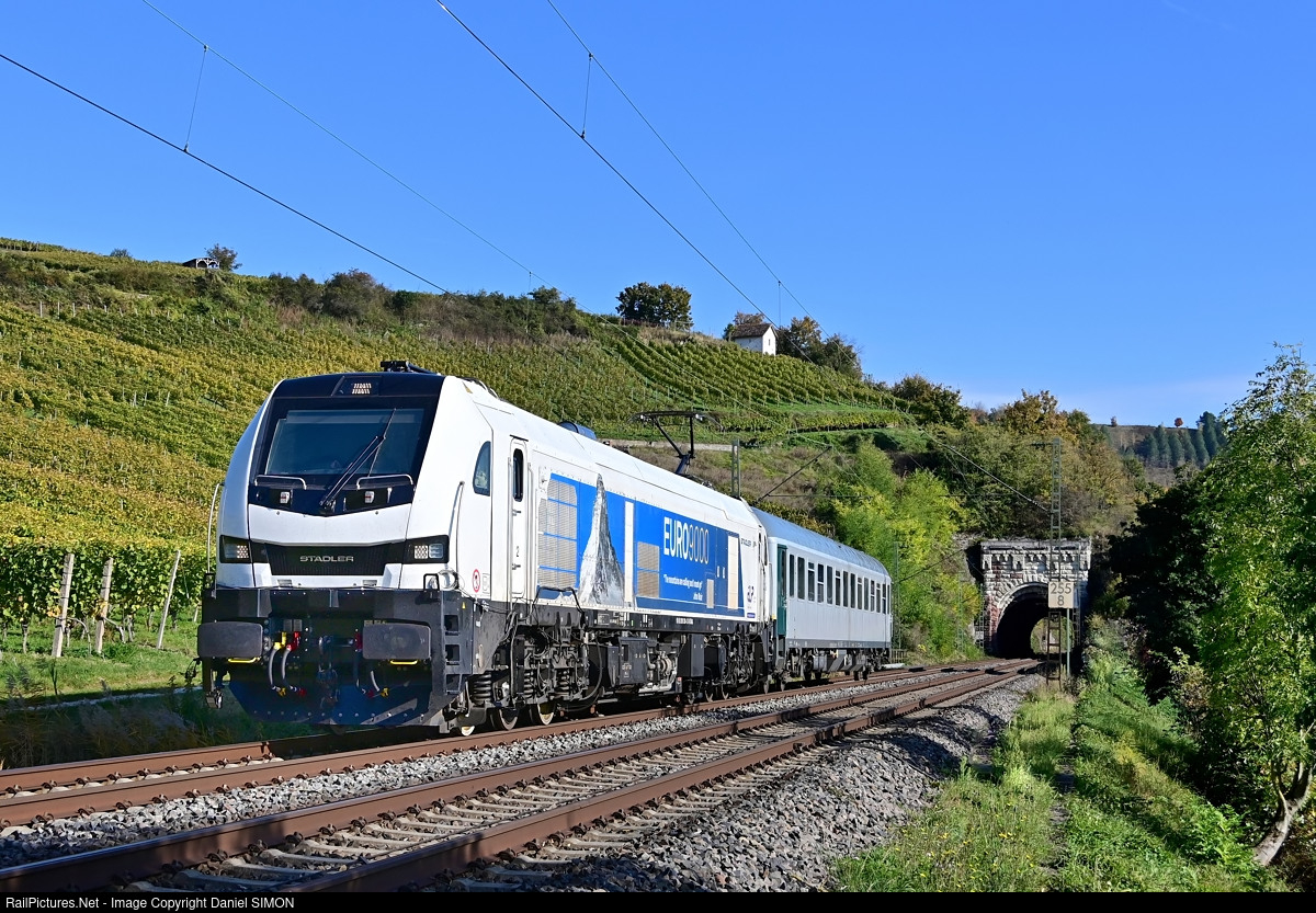 Test run of the Stadler EURO 9000 Electric multi-system locomotive between Basel and Freiburg. The EURO 9000 is the new Hybrid multi-system locomotive for use throughout Europe. The locomotive enables up to 500kN tractive effort with an output of 1.9MW in diesel mode and up to 9MW in electrical mode. The Euro 9000 platform is natural evolution of Stadler's successful EuroDual and Euro 4000 locomotive family. The Euro 9000 platform can be configured for different countries and corridors. For this purpose, there is the option of equipping the locomotive with diesel engines, battery packs, or a combination of these at two multifunctional mounting stations. The powerful Co'Co' locomotive features an innovative 3-level converter topology of the latest generation for best energy efficiency. The powerful single-axle control, in combination with the proven asynchronous traction motors ensures high reliability with best tractive effort. The Euro 9000 is a freight locomotive characterised by compact design, high performance and optimal operating costs. The two central driver's cabs offer the highest level of comfort with comfortable centrally placed seats, ergonomic controls, air conditioning and a modern interior design. The locomotive is delivered with ETCS BL3 as standard and depending on the country configuration, the corresponding national train protection systems will be integrated. Text source: European Loc Pool AG