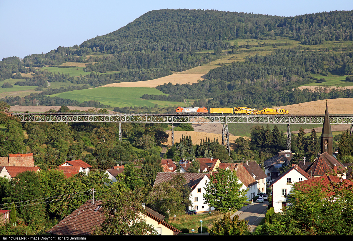 | On the Sauschwänzlebahn "Eurorunner" 2016 904 is crossing the viaduct of Epfenhofen with a track construction machine from Weizen to Blumberg and further on to Munich. |