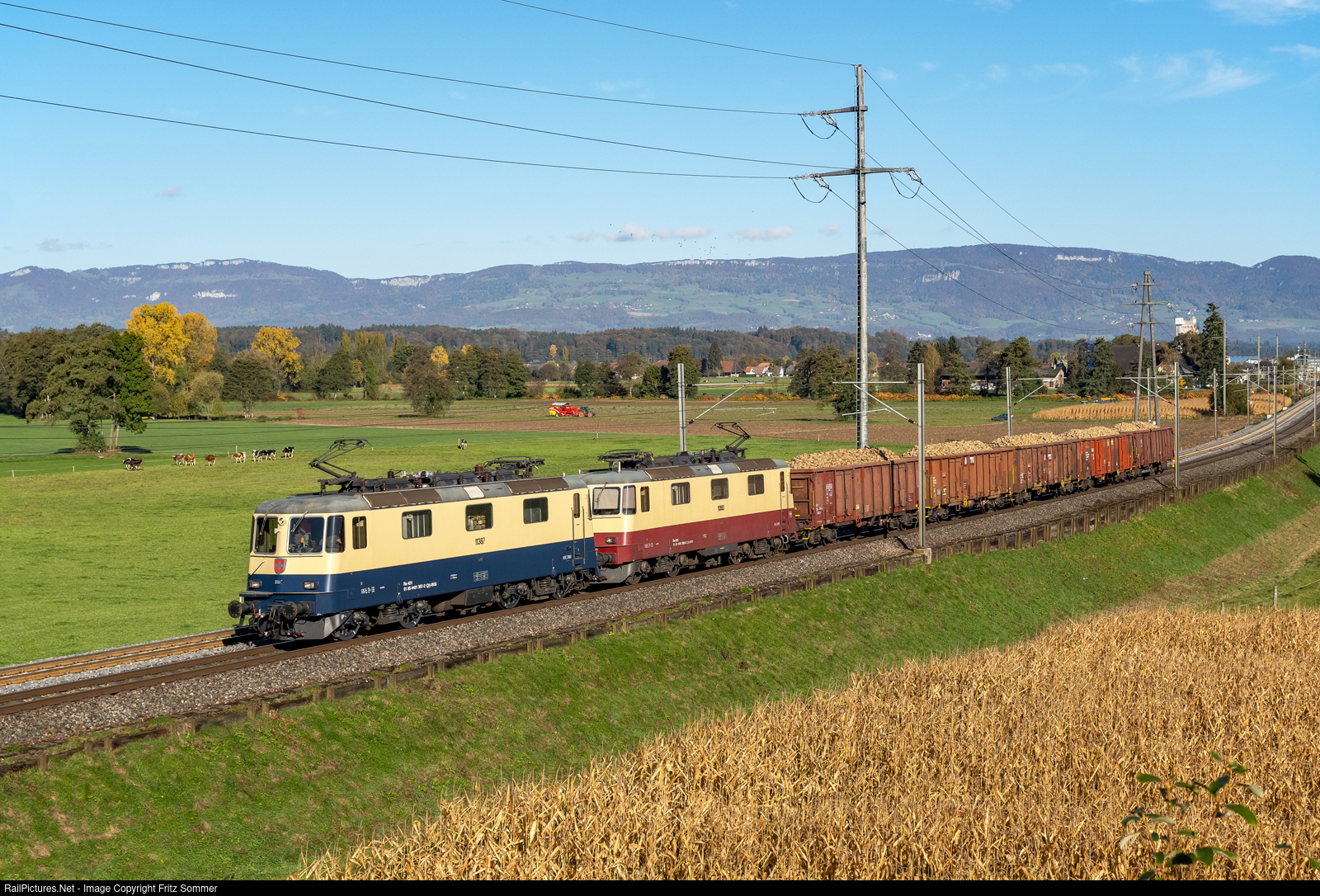 Nice IRSI duo near Bollodingen: The Re 421 387 (11387) and 421 393 (11393) were certainly not out of breath with this sugar beet train.