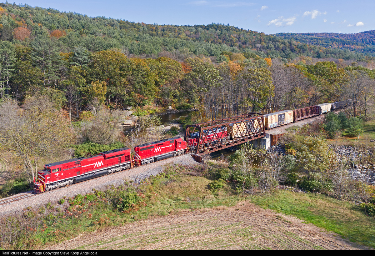 | Vermont Railway's GMRC 264 crosses the Williams River at Chester with a solid red lashup of the VTR 431, 307 and 206. |