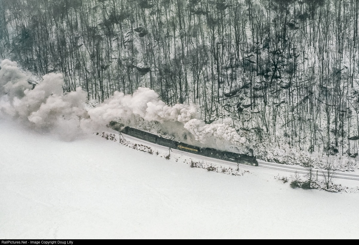 Skirting the frozen New River, Chesapeake & Ohio 4-8-4 614 works westbound at Hawk’s Nest, West Virginia.