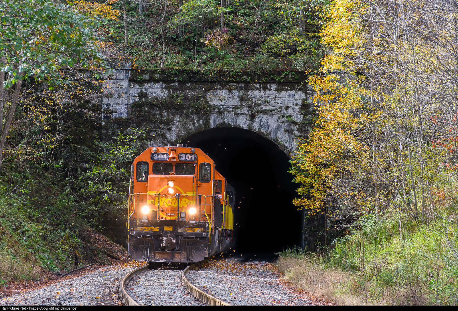 | A Wellsboro & Corning SD40-2 emerges from the north portal of Empire Tunnel in Portland Mills, Pennsylvania as it leads a Sunday extra RIJB, and heads towards Johnsonburg. This is the last of the ex-QNSL WCOR units remaining on the B&P, with the 307 and 309 having been sent to the CF&E. |