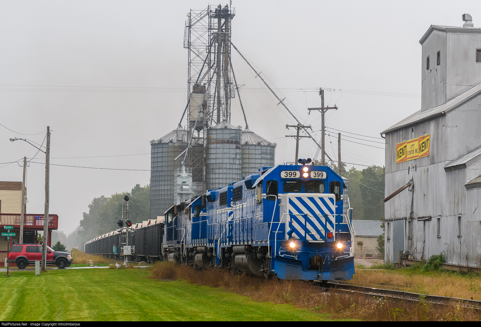 It's a dreary, rainy day in Cohoctah, Michigan as a trio of Great Lakes Central EMD's lead the OSTN southbound through town, past the old grain elevator complex. A pair of GP38-2's lead on the ex-MRL SD35's on this afternoon's run.