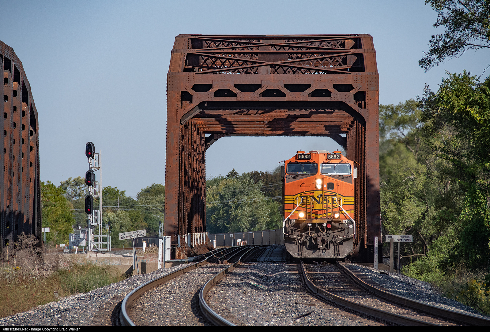 Rolling on CSX's Chicago Division and through the truss bridge spanning the Calumet-Sag Canal is BNSF Railway train C-NAMCXK8-70, carrying a load of coal from Wyoming's North Antelope Mine to Essexville, Michigan. BNSF AC4400CW 5682 and ES44AC 6043 are the power for this train, which is about to pass through CSX's Barr Yard before continuing eastward. (Blue Island, Illinois – September 27, 2021)