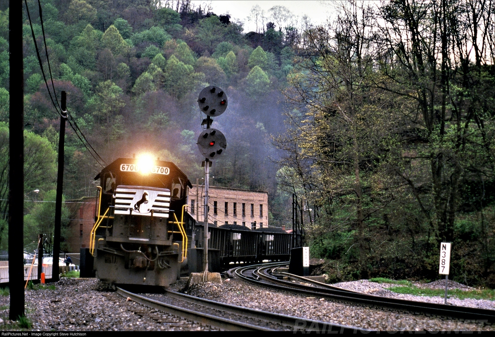 | It's late afternoon and the sun has sunk behind the mountains to the west as another loaded coal train negotiates the sharp curves and the eastbound Elkhorn grade heading for Bluefield West Virginia. |
