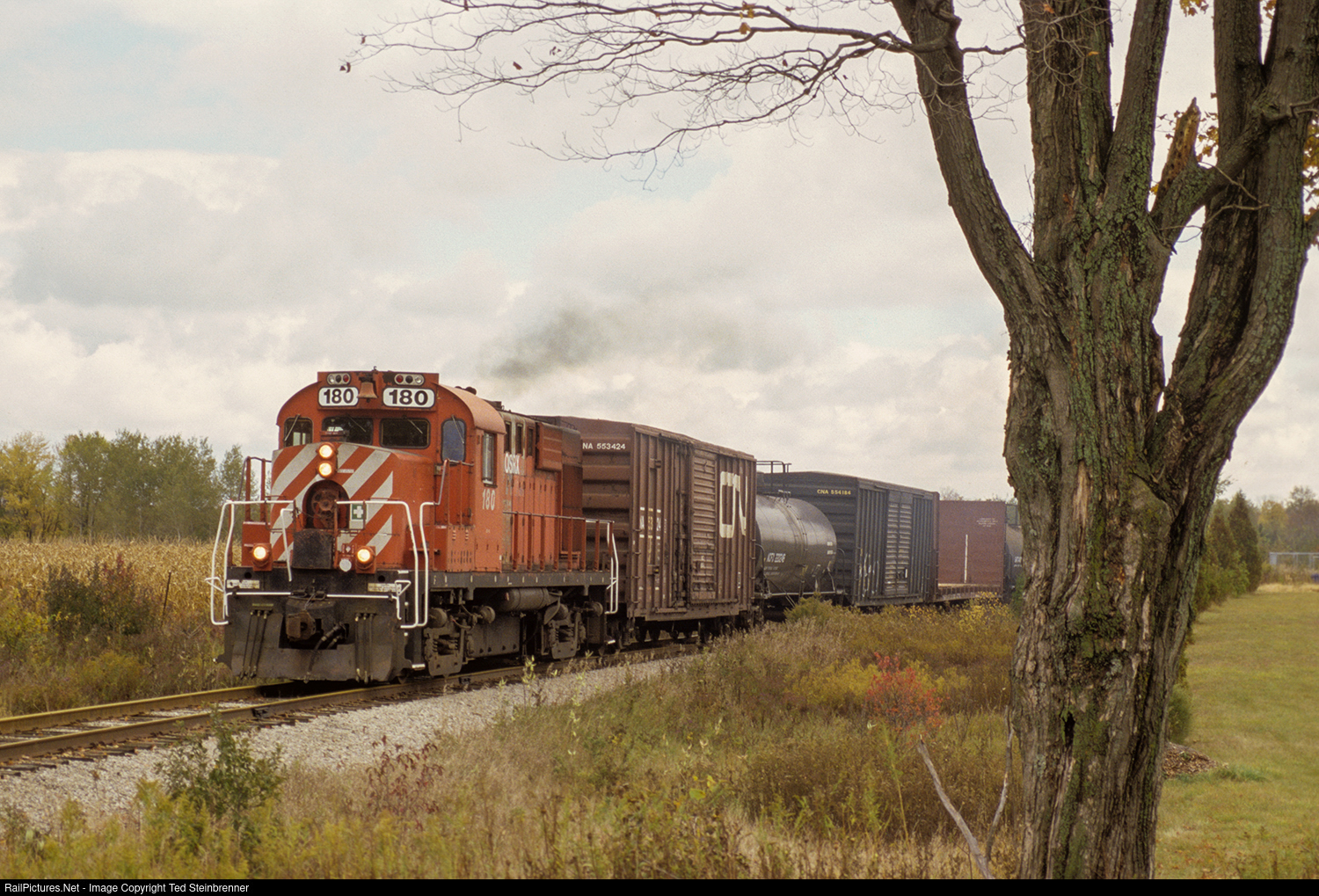 Continuing on our trip to western New York and southern Ontario in October 1998, we left the DL&W and the rain in Depew and headed west to the Ontario Southland’s new, at the time, operation of the Guelph Junction Railway. So many of the train chasing trips my father and I took in the 1980s and 1990s were built around chasing CP Rail MLWs in Vermont and Canada, but the CP Rail had operated it’s last MLW in the Summer of 1998. The day’s power, a former CP Rail RS-18u in patched CP Rail paint, helped ease the sting of this loss. Here, Ontario Southland #180, former CP Rail #1860 and, originally, RS-18 #8769, leads the train northbound at the First Line Nassagaweya Road crossing in Milton, Ontario. Ted Steinbrenner Photo.
