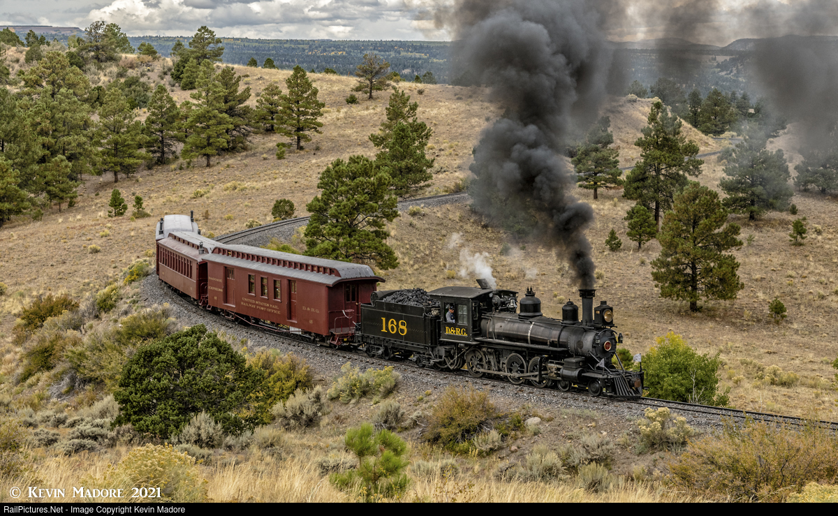 Rounding the curve at Big Horn. Charging eastward under a threatening sky, D&RG Locomotive #168 rounds the big curve below Big Horn Peak, near Milepost 299.6, with her passenger extra in tow. Although there is no water or fuel available here, and the Big Horn Section Crew was historically quartered about 4 miles to the east, there is a nearly 1,200 ft. siding here, which will hold 28 cars, and there is also a wye. Historically, Big Horn was a location where trains could pass each other, and it was a site where snow-fighting equipment and helper locomotives often turned. Today, in the tourist era, it's also a great place to turn a photo charter operating out of Antonito, avoiding a much longer run to Osier, and allowing a lot of opportunities for photography in the desert portion of the line.
