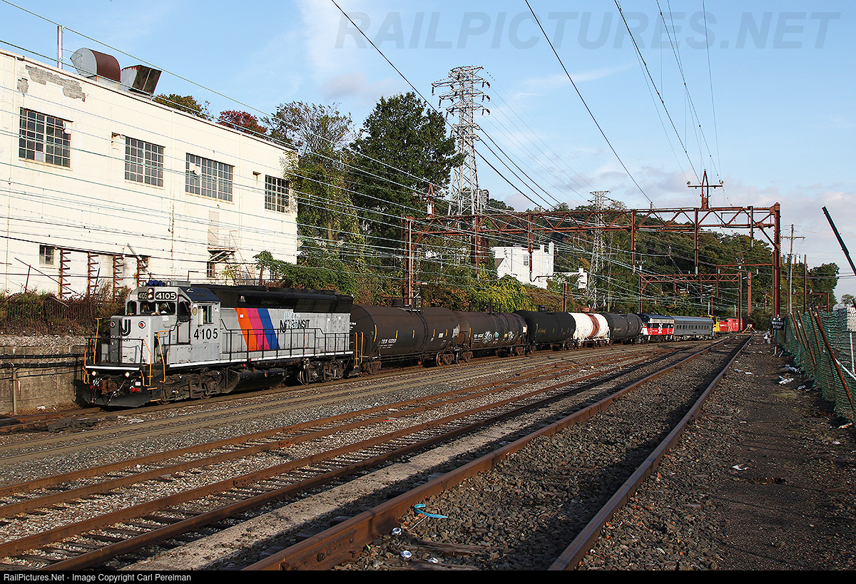 | Morristown & Erie MO-1 is westbound on the NJ Transit Morris & Essex Line. The train is towing interchange from the Conrail interchange in Kearny, including Webb Rail's New Haven FL9 2024. |