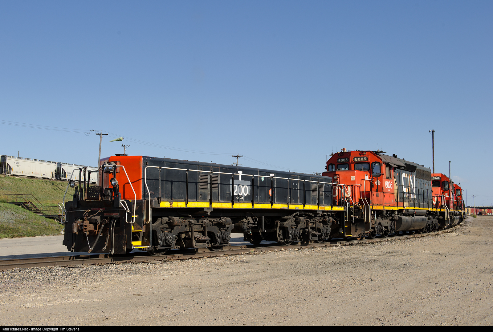| One of Symington Yard's 4 hump sets idles near the base of the hump. CN GP9 Slug 200, CN SD40u 6005, GTW SD40-3 5949 and GTW SD40-3 5943 make up the consist. |