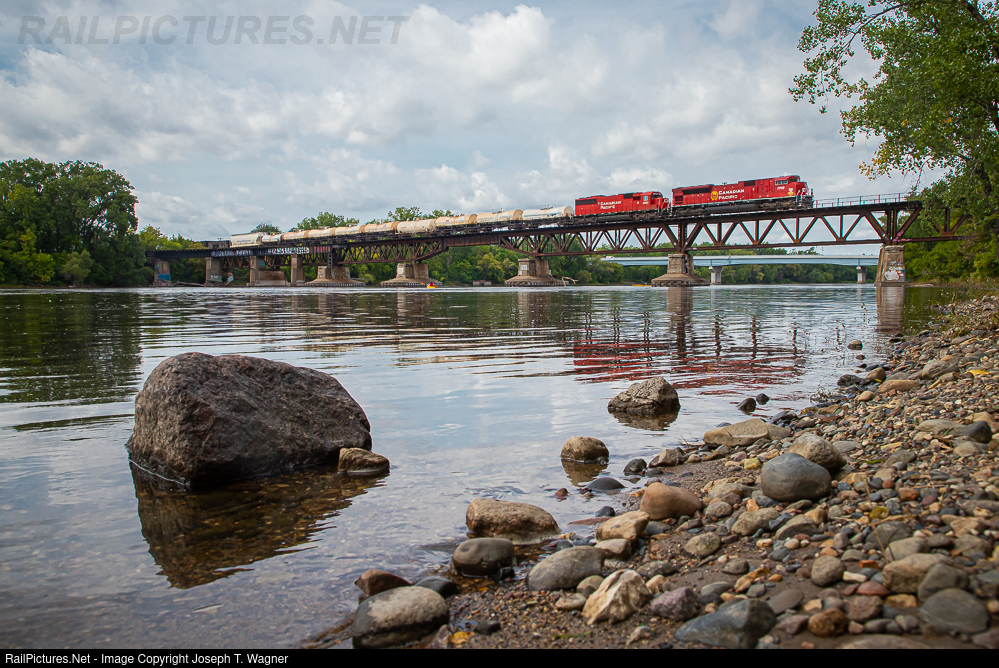 On an overcast Labor Day weekend, a sharp looking pair of Canadian Pacific EMD products slowly maneuver mixed freight #493-06 out of Humboldt Yard and across the 900+ foot Mississippi River truss bridge at Camden, suburb of Minneapolis. Currently operating over the Paynesville Subdivision, former SOO Line, this train will immediately cross atop BNSF's Northtown Yard behind me at Marshall St, exit the main at CP University onto the Shoreham Intermodal Loop Track and make a complete 360 degree turn before shoving itself out onto the BNSF St. Paul Sub at University Ave for its trip northward. This 493 and southbound counterpart 492 both utilize trackage rights on multiple different BNSF lines, though spending the most of their runtime on the Hinckley Subdivision for nearly 137 miles between Coon Rapids, MN and Boylston, WI, for gaining access to and from Stinson Yard in Superior.