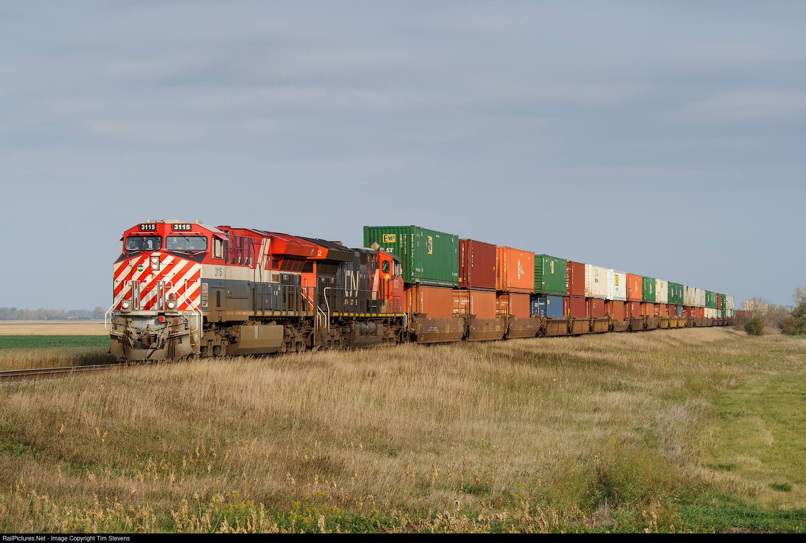 CN's BC Rail painted ET44AC 3115 gets Z115's train back up to track speed after clearing the PSO at Portage la Prairie.