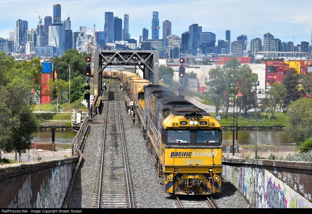 | Pacific National's NR99 and NR110 powers towards the Bunbury Street Tunnel, Footscray Melbourne with 5MP2, Steel Service bound for Perth. |