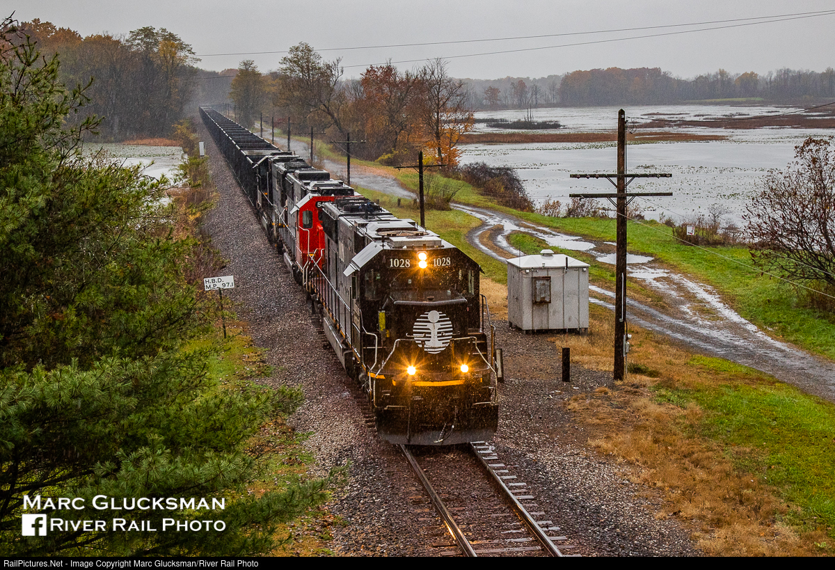 Swimming Through The Swamp. Canadian National Railways IC 1028 (SD70, EMD) leads CN Train U702 through Hartstown Swamp in Hartstown, Pennsylvania on the morning of October 31, 2019 in a monsoon. In spite of the driving rainstorm, a long string of loaded ore cars can be seen behind the trio of SD70s traversing the CN Bessemer Sub.