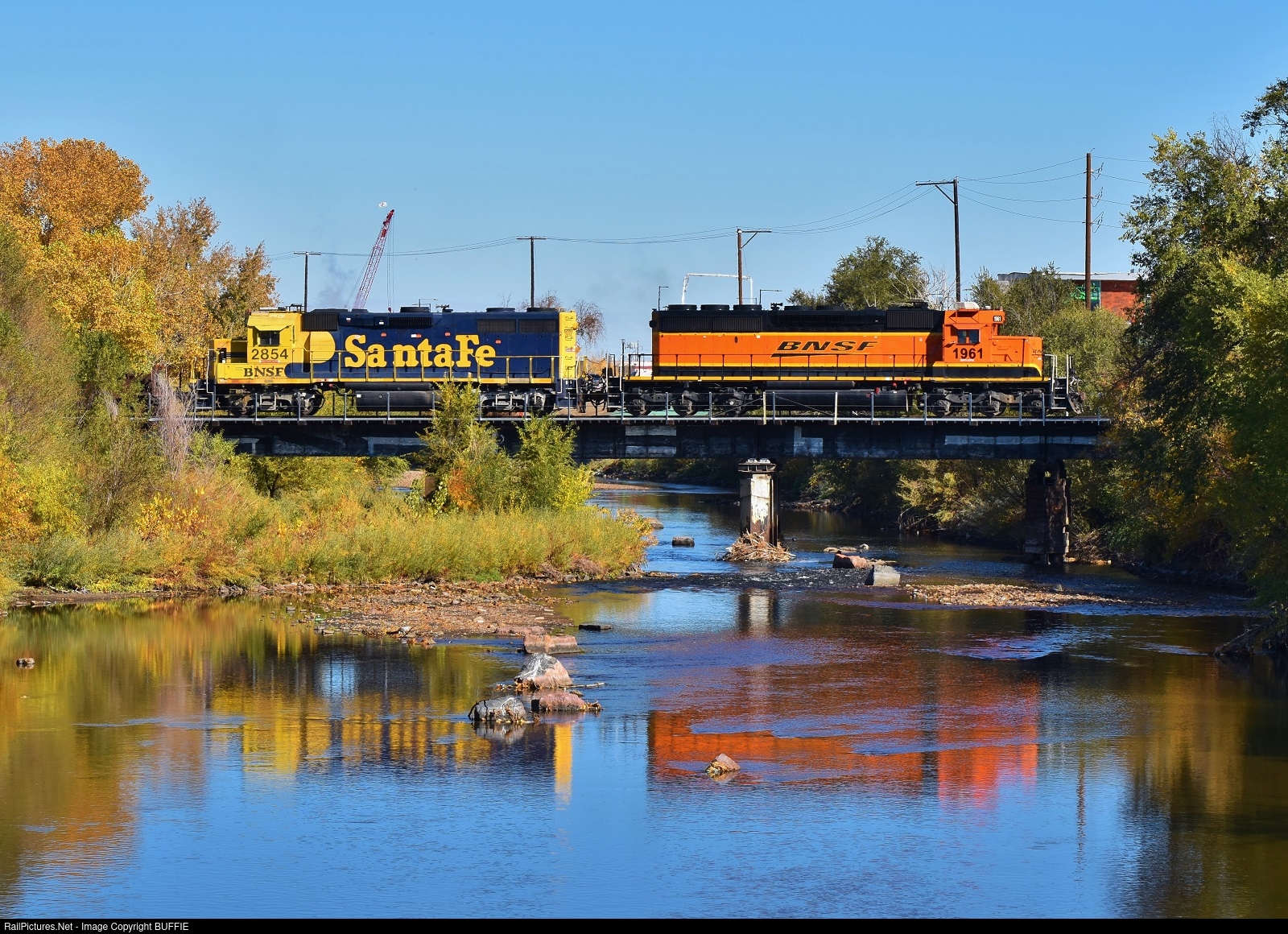 A pair of BNSF motors cross the bridge in the Stockyards area of Denver, Colorado.