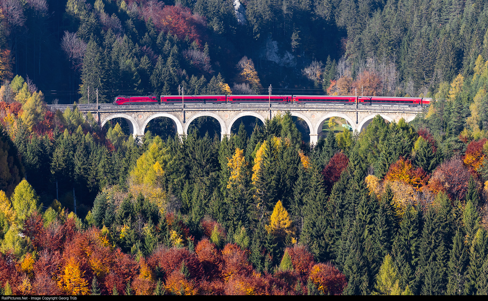 | Siemens "Taurus" locomotive 1116 # 246 of the ÖBB (Austrian State Railway) is crossing the 184 meter long and 46 meter high Kalte Rinne viaduct (built 1848 to 1854) on the Semmering north ramp with the RailJet RJ 559 from Vienna Airport via Vienna main station to Graz. The 41 kilometer long Semmering pass line from Gloggnitz to Mürzzuschlag, opened in 1854 and built by engineer Karl von Ghega, is declared UNESCO World Heritage since 1998. |
