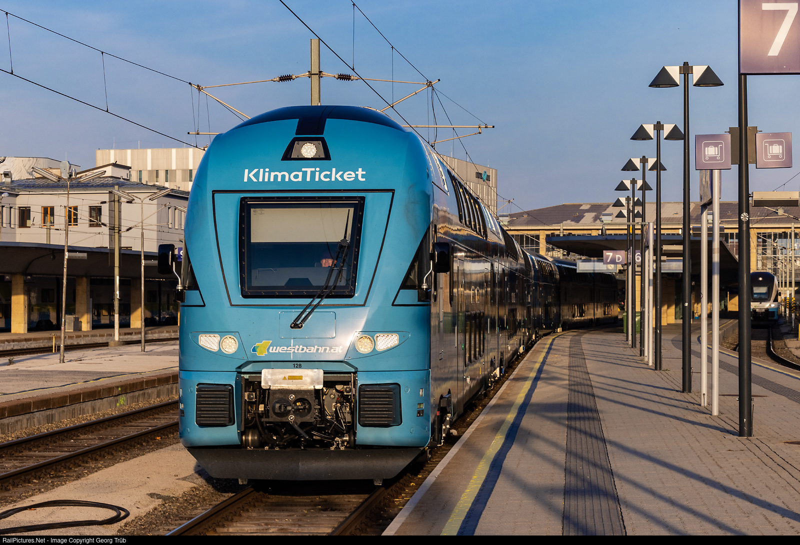 | On the second day of the new "KlimaTicket" (one year global ticket for public transport in Austria for 1095 Euro only), the new doubledeck intercity trainset 4010 # 028 in the special "Klima Ticket" paint scheme, is leaving Wien Westbahnhof as train 922 to Salzburg. This train is one of 15 new 6-car trains for 200 km/h, delivered by StadlerRail in 2021, replacing the current fleet of similar trains. |