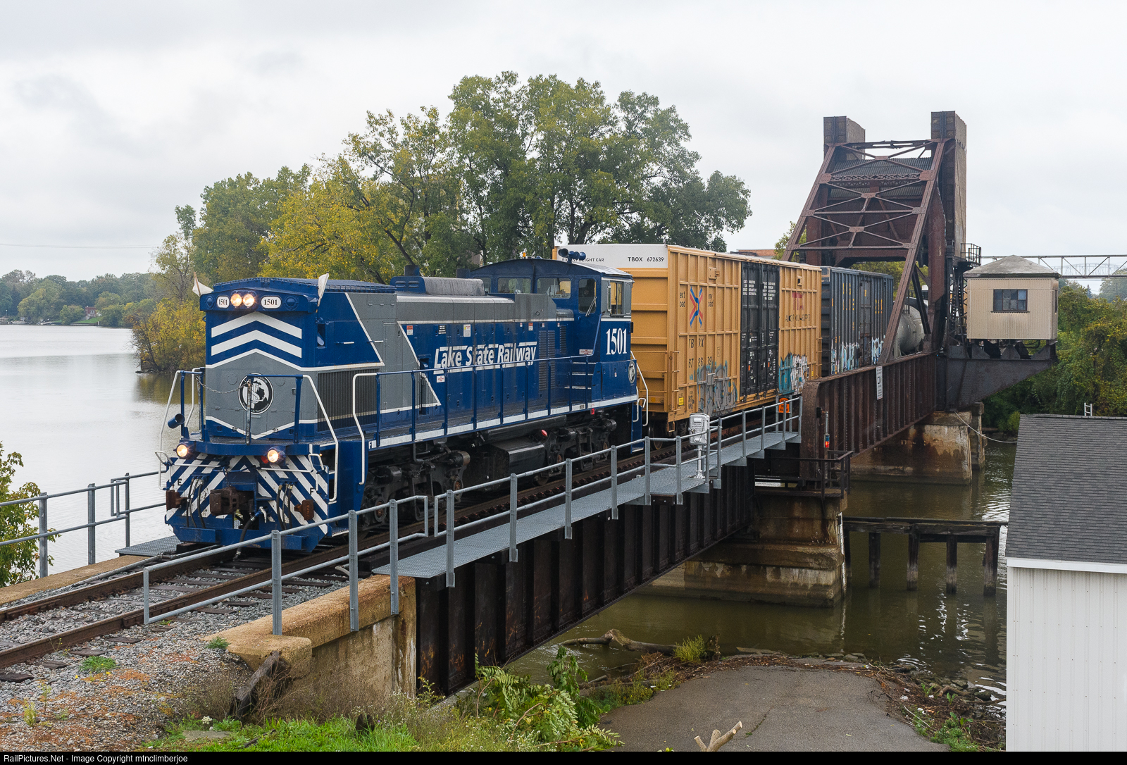 | The Lake States Railway's Y505 local rolls across the drawbridge that spans the Black River in Port Huron, Michigan behind an MP15AC. After clearing the bridge, the conductor will raise the span and the train will continue down the line to interchange with CN at their yard. |