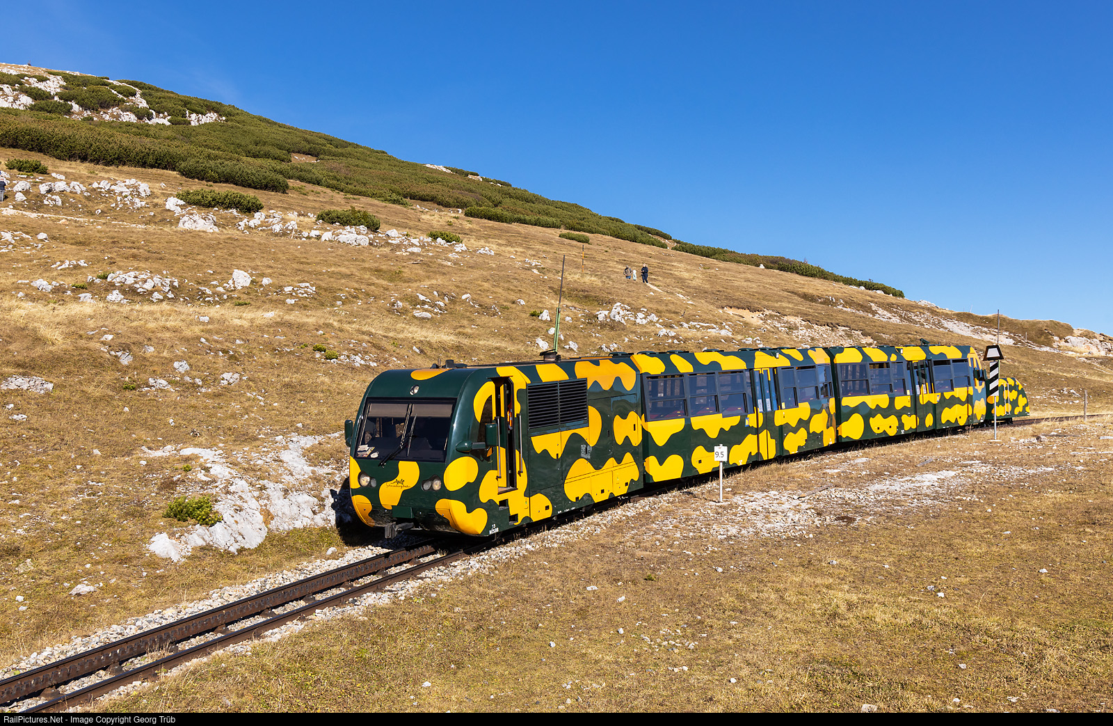 1 meter gauge diesel cogwheel train "Salamander" # 13 of the Schneebergbahn is leaving the Hochschneeberg down to Puchberg am Schneeberg. The "Salamander" trains, built in 1999 by Waagner-Biro, Hunslet-Barclay and Swoboda/carvatech, are push-pull trains with a 544 kW diesel cogwheel locomotive, an intermediate car and a cab car in front (when running up) with 119 seats in total. The 9,8 kilometer long Schneebergbahn from Puchberg am Schneeberg on 577 meter a.s.l to the Hochschneeberg on 1796 meter a.s.l. with the Abt cogwheel system is owned and operated by the NÖSBB (Niederösterreichische Schneebergbahn Gmbh) and was opened in 1897.