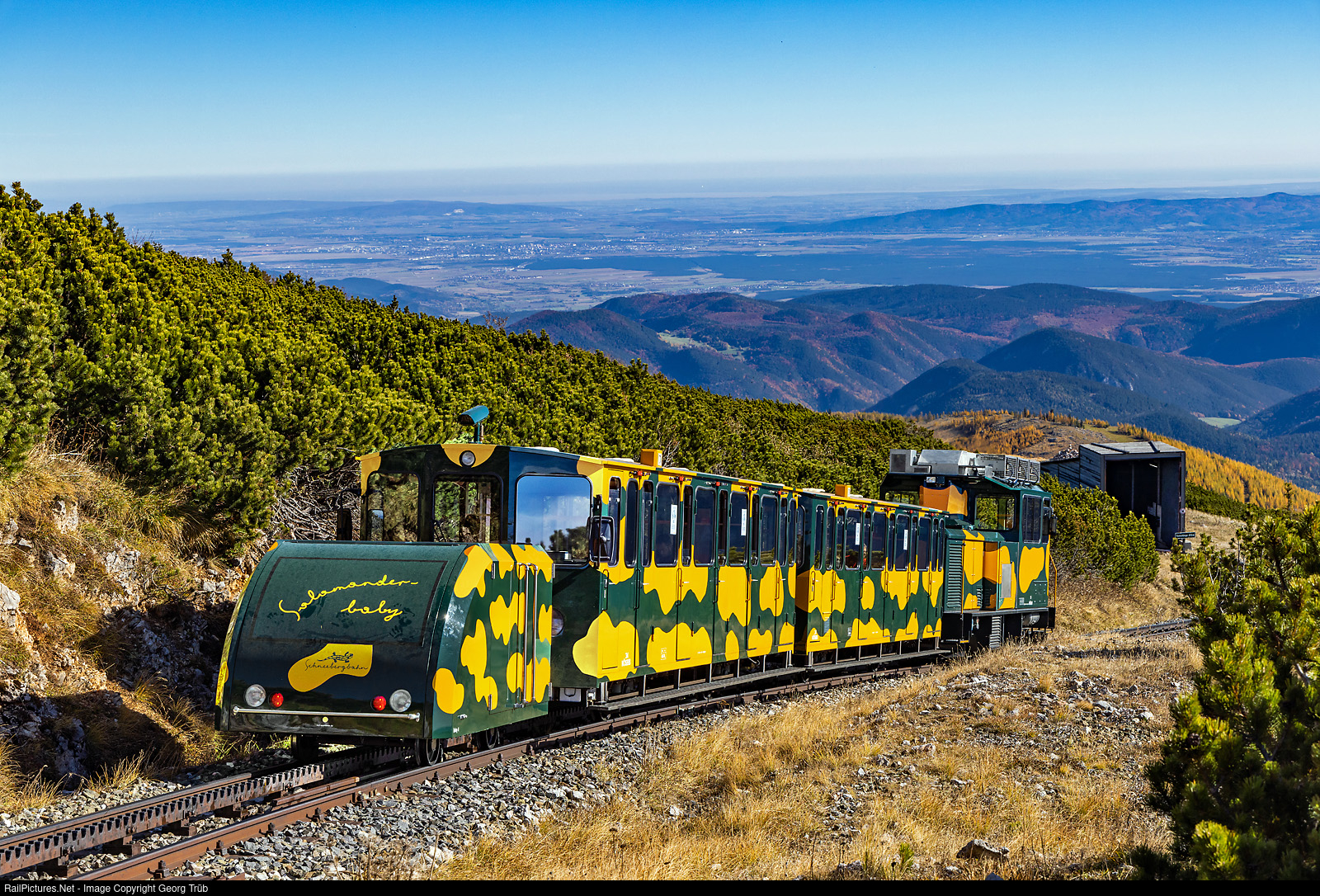 1 meter gauge cogwheel train of the Schneebergbahn near the top of the mountain. Diesellocomotive Hm 2/2 # 14, built by StadlerRail in 2010, is shoving cars # 24 and # 34, and in front the small "Baby" # 4, used to load baby strollers etc. The 9,8 kilometer long Schneebergbahn from Puchberg am Schneeberg on 577 meter a.s.l to the Hochschneeberg on 1796 meter a.s.l. with the Abt cogwheel system is owned and operated by the NÖSBB (Niederösterreichische Schneebergbahn Gmbh) and was opened in 1897.