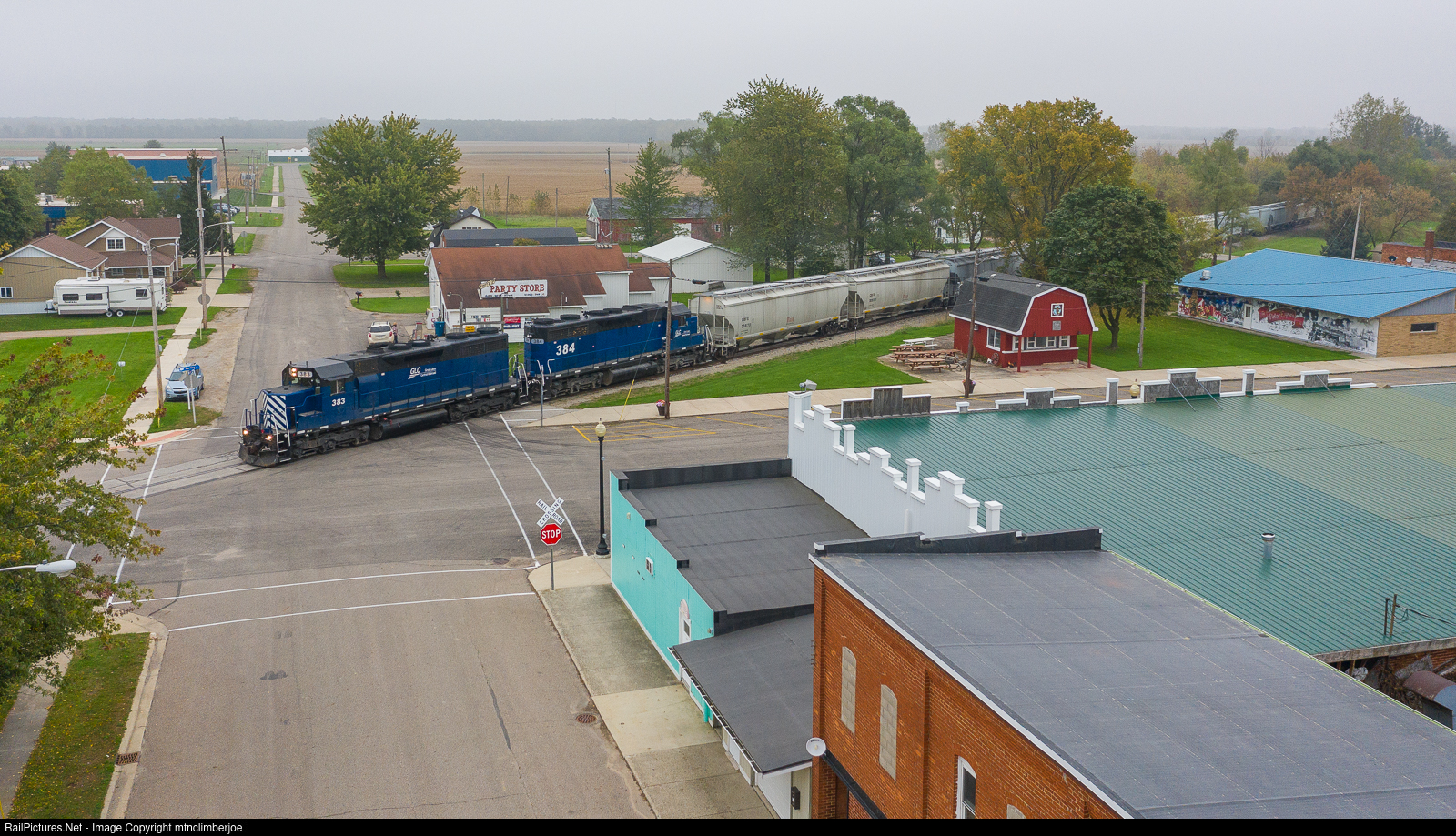 | A pair of ex-MRL SD35's leads the Great Lakes Central's ONTN as it heads north on a foggy morning and passes through the center of town in Ashley, Michigan. |