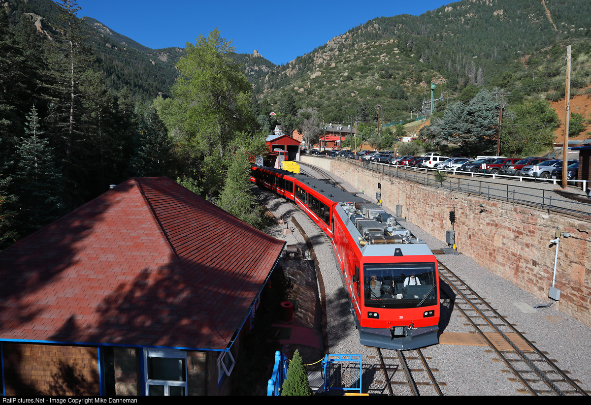 One of Manitou & Pikes Peak Railway’s new cog diesel-electric locomotives and trainset approach the Manitou Springs station on the morning of August 25, 2021. Three trains were built by Stadler Rail of Switzerland with each trainset consisting of a locomotive and three passenger cars, with the last car additionally equipped as a cab control car. The M&PPR reopened in May 2021, after being shut down for nearly four years—during which time the railway was totally reconstructed, older cars were rebuilt and this new equipment was built and delivered.