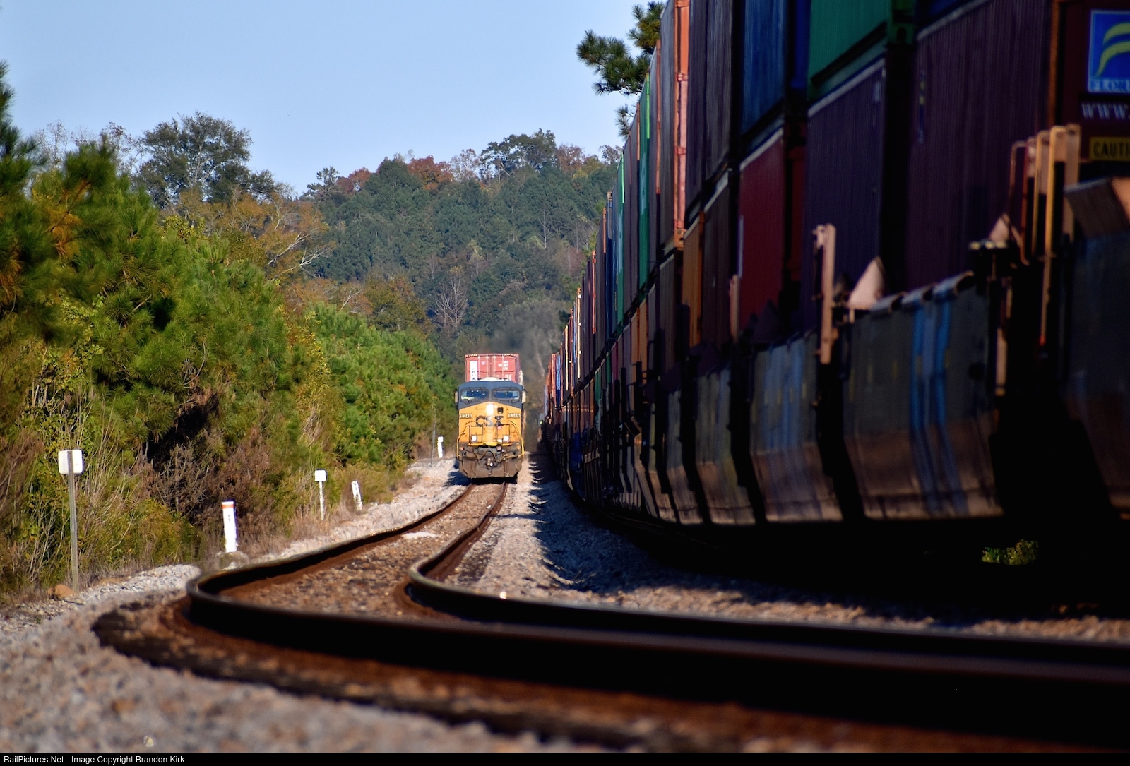 | Containers occupy both the mainline and siding as one train waits for the other to clear. Headed straight for the lens of my Nikon camera, is CSX train Q142 and its leading GE. The mainline train just got a fresh crew and had to wait for nearly an hour for this one because it was the closes siding it could fit in. |