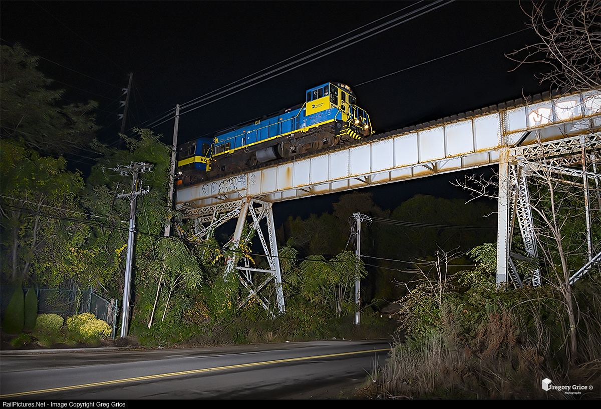 On the morning of November 3rd, 2021, Long Island Rail Road's "LaserTrain" is seen heading east over Bread and Cheese Hollow Road on the Port Jefferson Branch in Kings Park, NY with "glass out" MP15AC 150 leading the way.