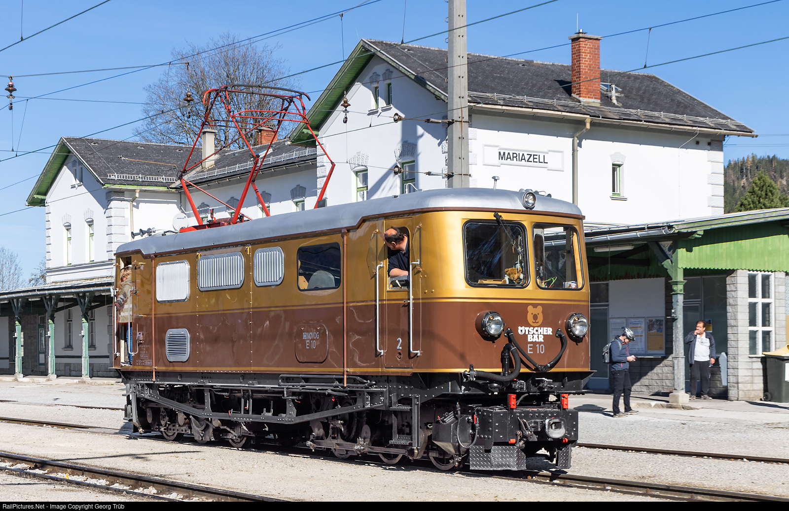 | NÖVOG electrolocomotive E # 10 (former ÖBB 1099.010) of the Mariazellerbahn (owned and operated by the Niederösterreich Bahnen NÖVOG) reached Mariazell with the "Ötscherbär" train 6891 from St.Pölten. This train is running on saturdays only. The C'C' locomotive E # 10 for 6500 V DC and a gauge of 760 mm was built in 1911 by Krauss and Österreichische Siemens Schuckert Werke for the Niederösterreichischen Landesbahnen. Rebuilt around 1960 with a new body. In this brown/golden paint scheme since spring 2021. |