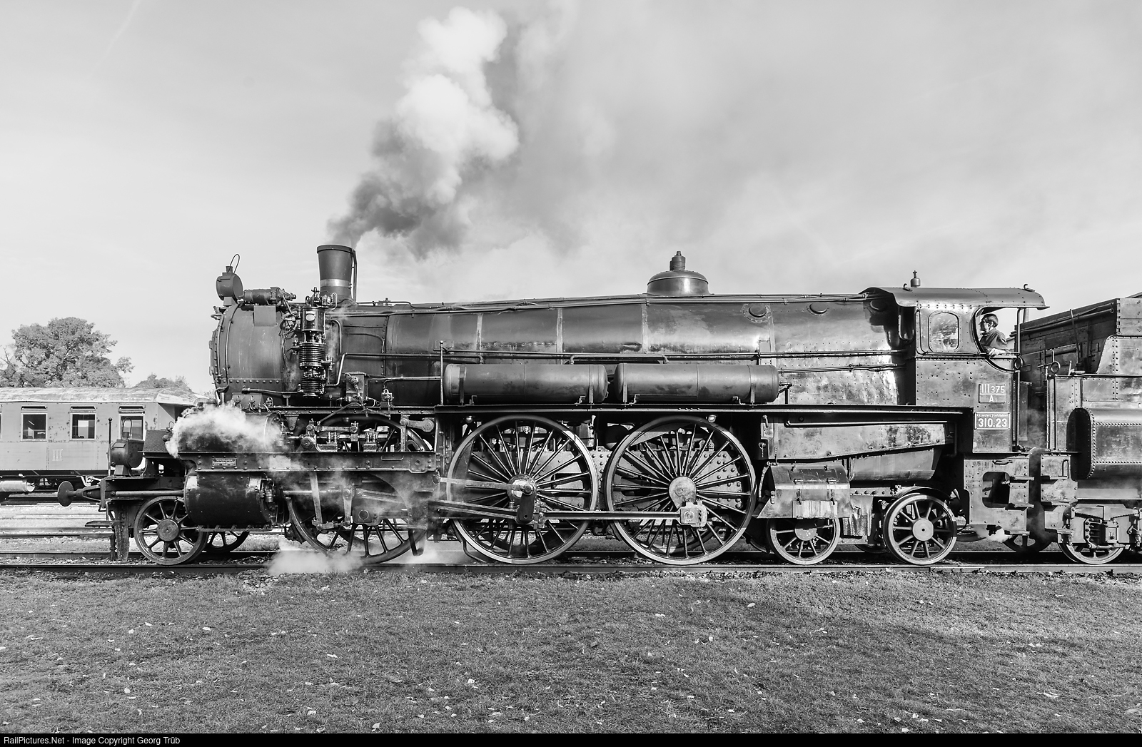 2-6-4 fourcylinder compound express train steamlocomotive 310 # 23 in the Heizhaus Strasshof railway museum near Vienna, on the occasion of the "steam day". Between 1911 and 1916, the kkStB (kaiserlich-königliche Staatsbahnen) procured a total of 90 locomotives for express service on the Northern Railway, the Franz-Josefs Railway and the Western Railway. Despite the imposing driving wheel diameter of 2,140 meters (78,74 inches), the locomotives were only approved for 100 km/h. The design had to take into account that both the axle loads and the overall length were limited within narrow limits by track and turntable conditions. Karl Gölsdorf had already addressed this with the 210 series and now modified it so that it was powered by a superheated steam four-cylinder compound engine. Because of the sluggish controls, however, the locomotives designated as the Series 310 remained flatland engines, but there they produced up to 1800 hp. The locomotives were supplied by the Floridsdorf locomotive factory, the Wiener Neustädter Lokomotivfabrik, the Bohemian-Moravian machine factory, the StEG locomotive factory and the Bohemian company Breitfeld & Dan?k. The locomotive 16.08, which was taken out of service in 1956, was initially set up as a museum locomotive in front of the Vienna Technical Museum, but was then restored and made operational again in 1985-1987 for the 150th anniversary of the Austrian (mechanically powered) railroads. It is used for nostalgia trips under the old number of kkStB 310.23 and is stationed at the Strasshof Railway Museum. The boiler was rebuilt in 1999 under the partial sponsorship of the model railway company Roco, which released a special H0 model of the 310.23 for the occasion. The old boiler can be seen on the grounds of the Strasshof Railroad Museum.