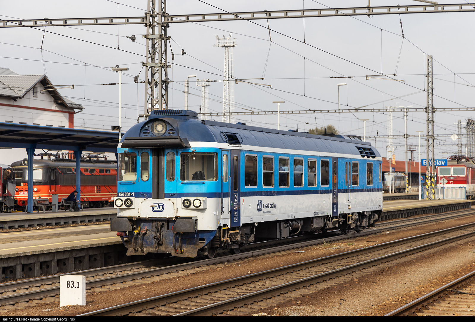 | Diesel railcar 854 # 201 of the Ceske Drahy in Breclav, on duty on the single track line from Breclav (Lundenburg) to Znoymo (Znaim). Reconstructed in 2006 with a new 588 kW Caterpillar prime mover from the 852 series of 1968/1969. This railcars are usually pulling one passenger car and are running around in the stations of Breclav and Znoymo. |