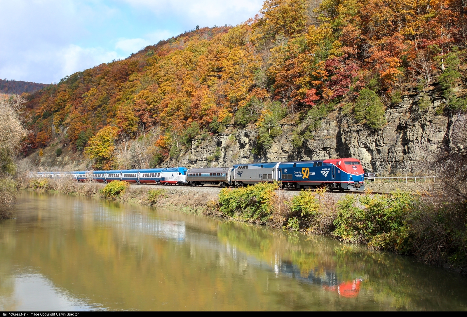 | Amtrak 50th Anniversary P42 108 is in charge of today's Amtrak Extra 973 as it rolls east along the Norfolk Southern's Southern Tier Line at CP ADRIAN. In tow on this chilly fall day is P42 89, First Class Conference Car 9800, and Avelia Liberty Trainset #3 (AMTK 2108/2109). This trainset is the first fully completed trainset to be delivered to Amtrak will be delivered to Philadelphia for acceptance testing. |