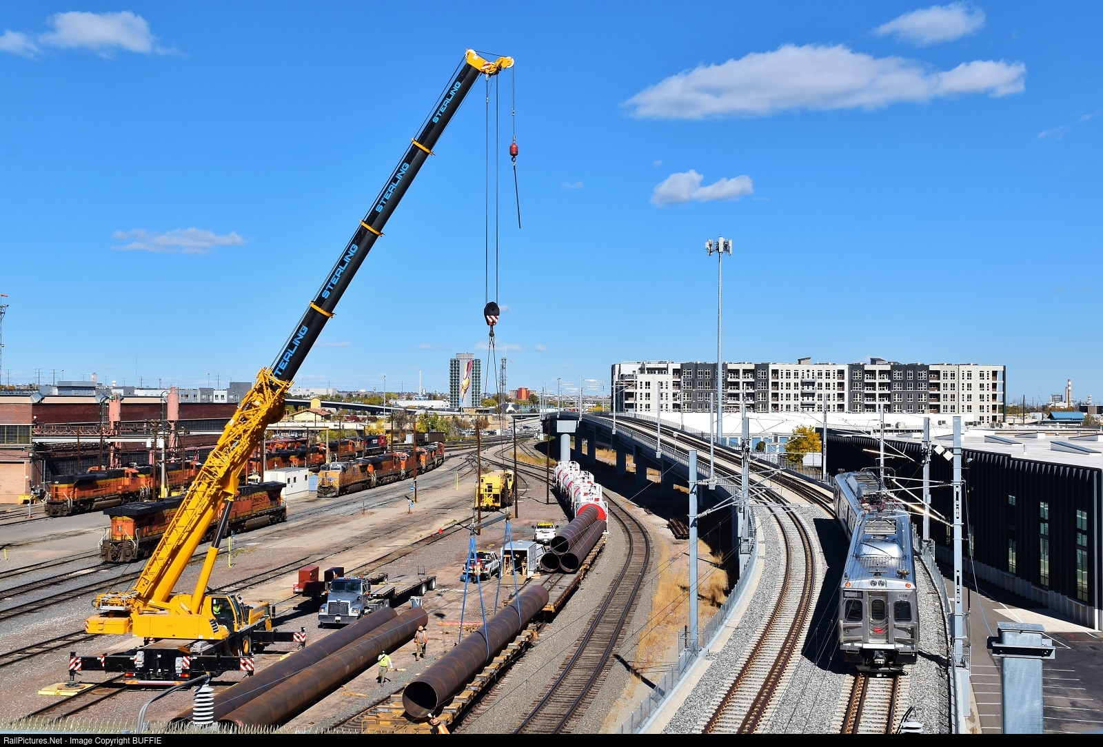 RTD 4019 runs past a crane crew unloading large pipes in the yard of the BNSF engine servicing facility.