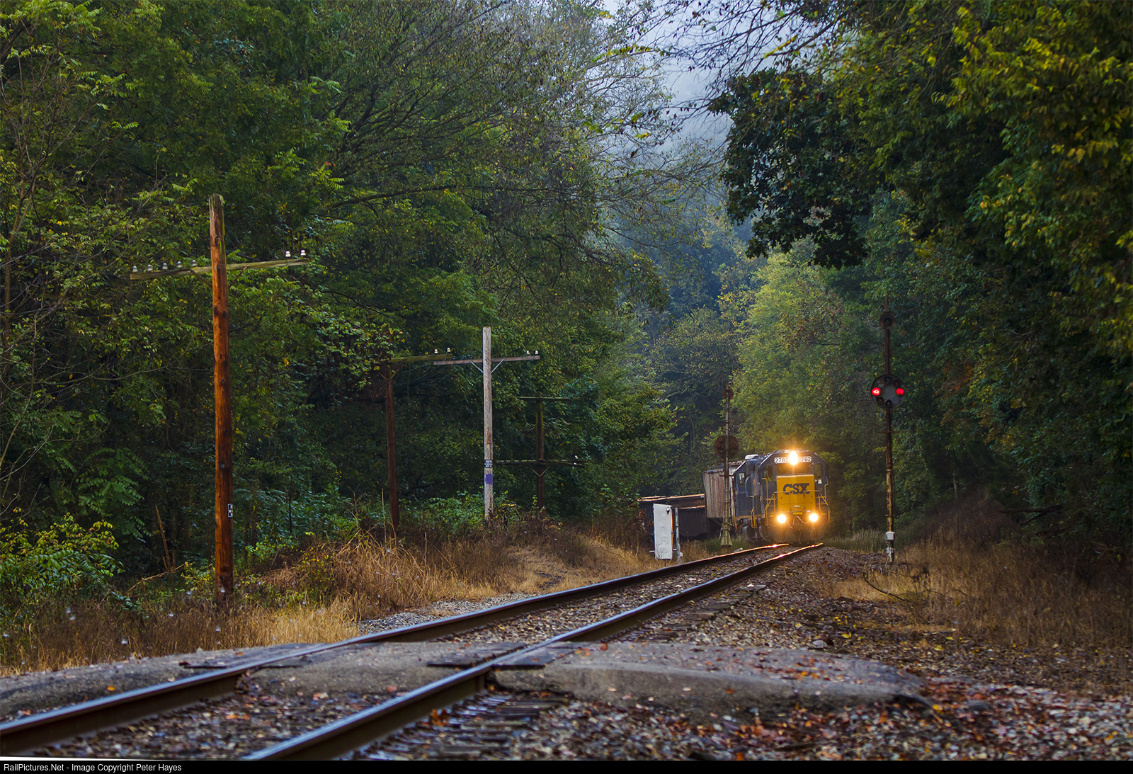 | As the morning fog burns off, J780 begins its eastward run. This is the only train these days lighting up the CPLs at WE Tunnelton, once the site of a short siding perfect for meeting hot passenger trains...and long deemed unnecessary. |