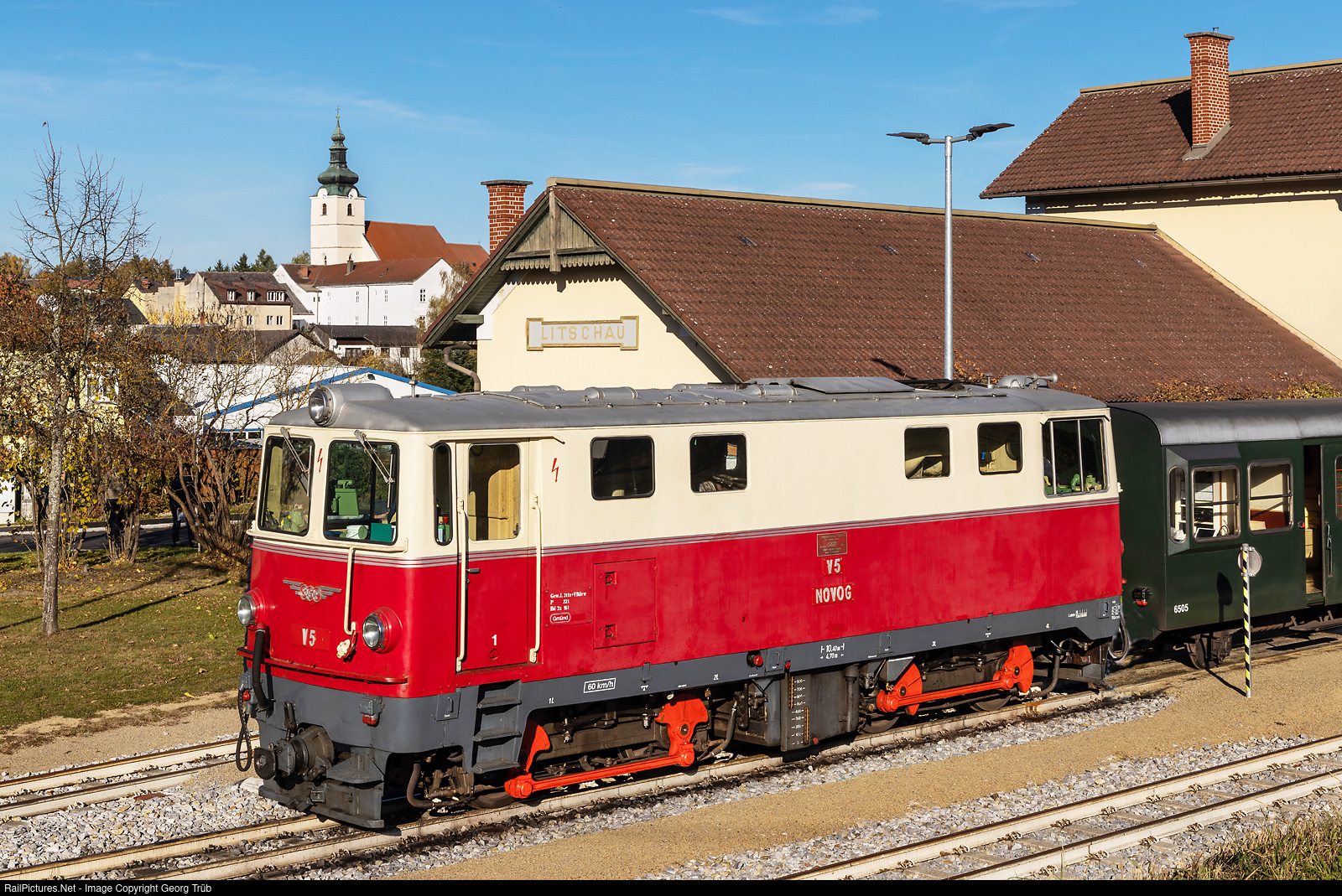 Diesellocomotive V # 5 of the NÖVOG (Niederösterreichische Verkehrs-Organisations-Gesellschaft), former 2095 # 05 of the ÖBB, in front of the Litschau railway station of the 760 mm gauge "Waldviertelbahn". The 440 kW locomotive was built by Simmering-Graz-Pauker (SGP) in Floridsdorf in 1960 for the austrian state Railways (ÖBB), in a series of 15. Locomotives of this type are operational on several 760 mm gauge railways in Austria.