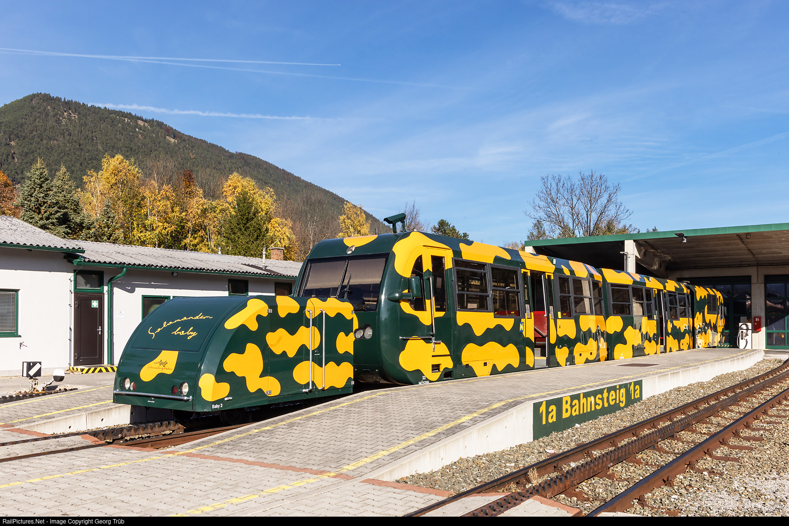 1 meter gauge cogwheel diesel push-pull train "Salamander" of the Schneebergbahn in Puchberg am Schneeberg station. In front the "Baby" # 3, used for the transport of baby strollers, wheelchairs etc, followed by cab car # 33, intermediate car # 23 and diesellocomotive # 13 in the rear. The 3 "Salamander" trains were built in 1999 by Waagner-Biro, Hunslet-Barclay and Swoboda/carvatech with a 544 kW diesel cogwheel locomotive and have 119 seats. The 9,8 kilometer long Schneebergbahn from Puchberg am Schneeberg on 577 meter a.s.l to the Hochschneeberg on 1796 meter a.s.l. with the Abt cogwheel system is owned and operated by the NÖSBB (Niederösterreichische Schneebergbahn Gmbh) and was opened in 1897.
