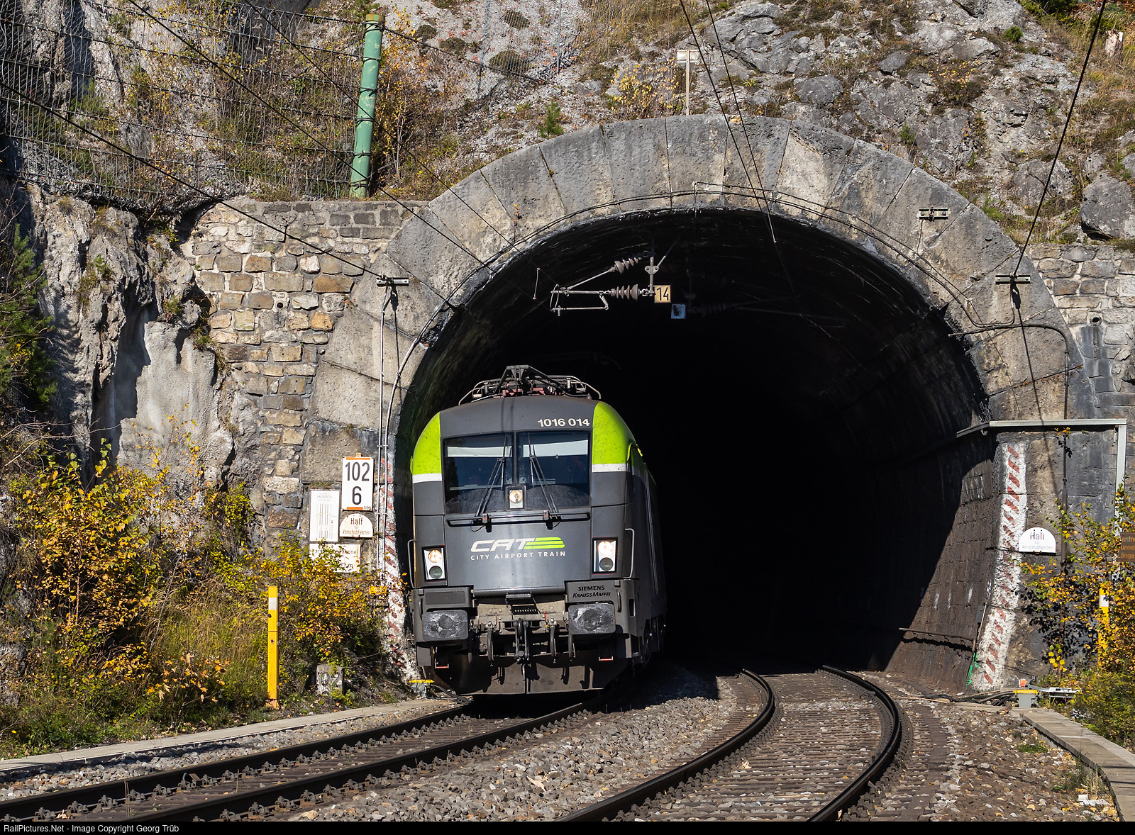 Siemens "Taurus" ES64-U2 1016 # 014 of the ÖBB in the paint scheme "CAT" (City Airport Train) is leaving the 201 meter long Kartnerkogel tunnel on the Semmering line with a short freight train.