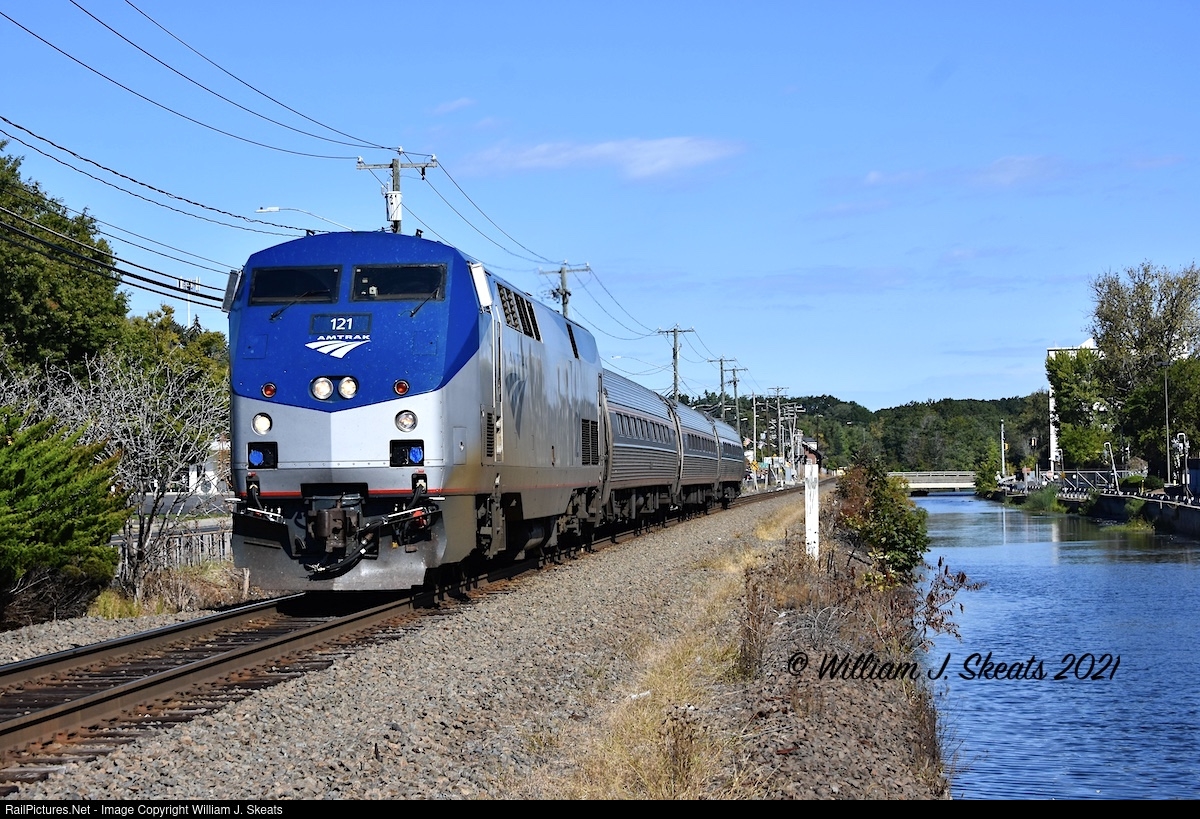 | Amtrak Valley FlyerTrain 461 from Greenfield, Massachusetts to New Haven, Connecticut. P42DC 121 and three Amfleets running along the Windsor Locks Canal. Ahlstrom-Munksjo Plant to the right. |