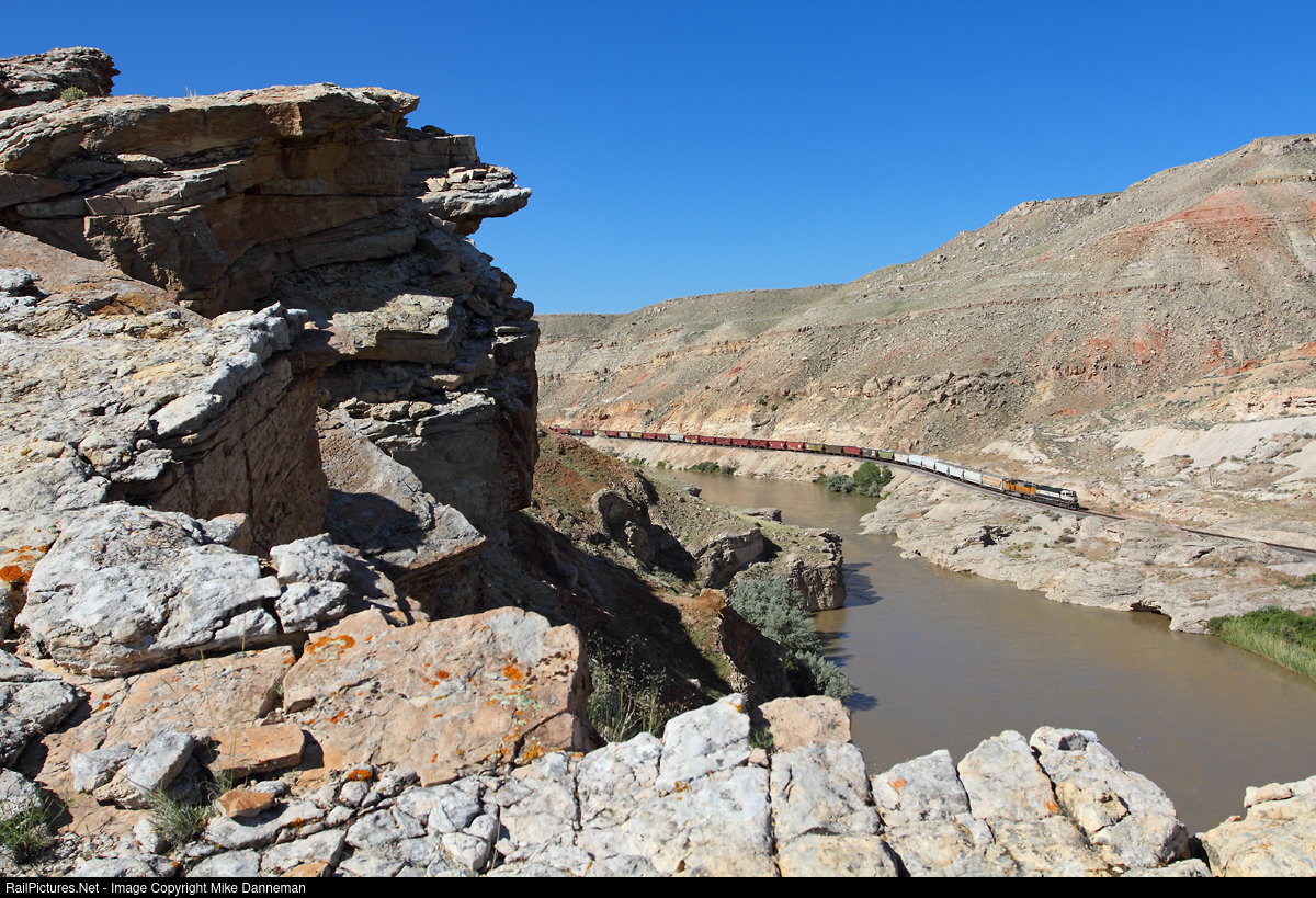 BNSF’s Cowley turn trundles northbound through the stark landscape of Himes Canyon along the Bighorn River between Himes and Kane, Wyoming, on the morning of June 27, 2018.