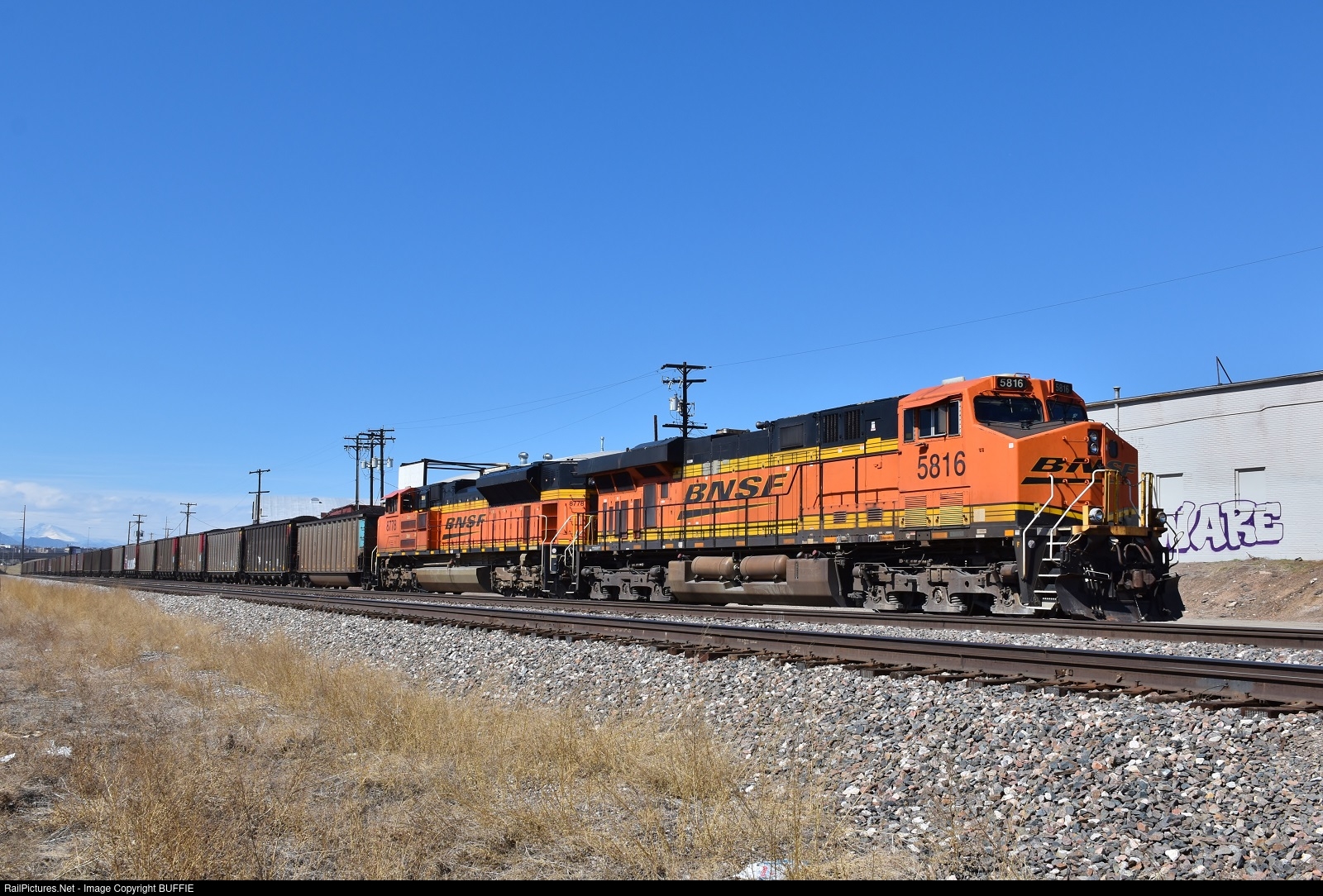 | BNSF 5816 (ES44AC) gets ready to take a loaded coal train south of Denver, Colorado on the Joint Line. |