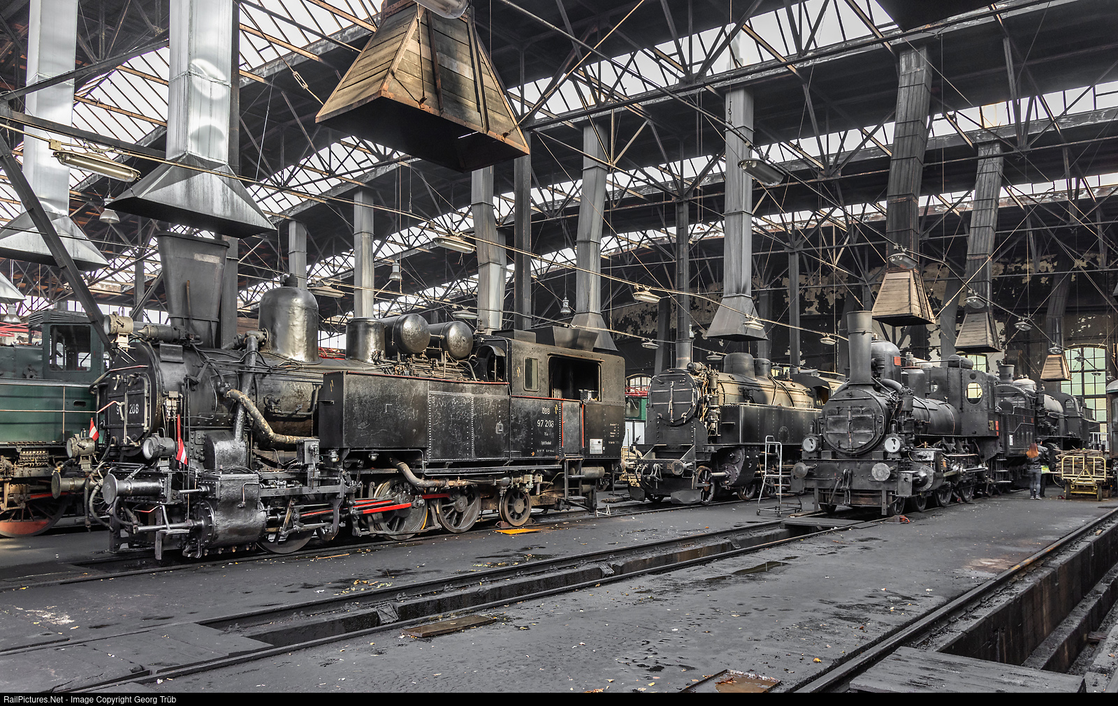 View into the large hall of the Heizhaus Strasshof railway museum, full with steam, electro and diesel locomotives. From left to right: Cogwheel steamlocomotive 0-6-2 T 97 # 208, used on the Erzbergbahn. 4-6-2 T 629 # 01 built in 1913 by the Staats-Eisenbahn-Gesellschaft. 4-4-0 17c # 372 of 1891 (Wiener Lokfabrik Floridsdorf). 2-10-0 freight train locomotive 580 # 03, built in 1912 by the Staats-Eisenbahn-Gesellschaft.