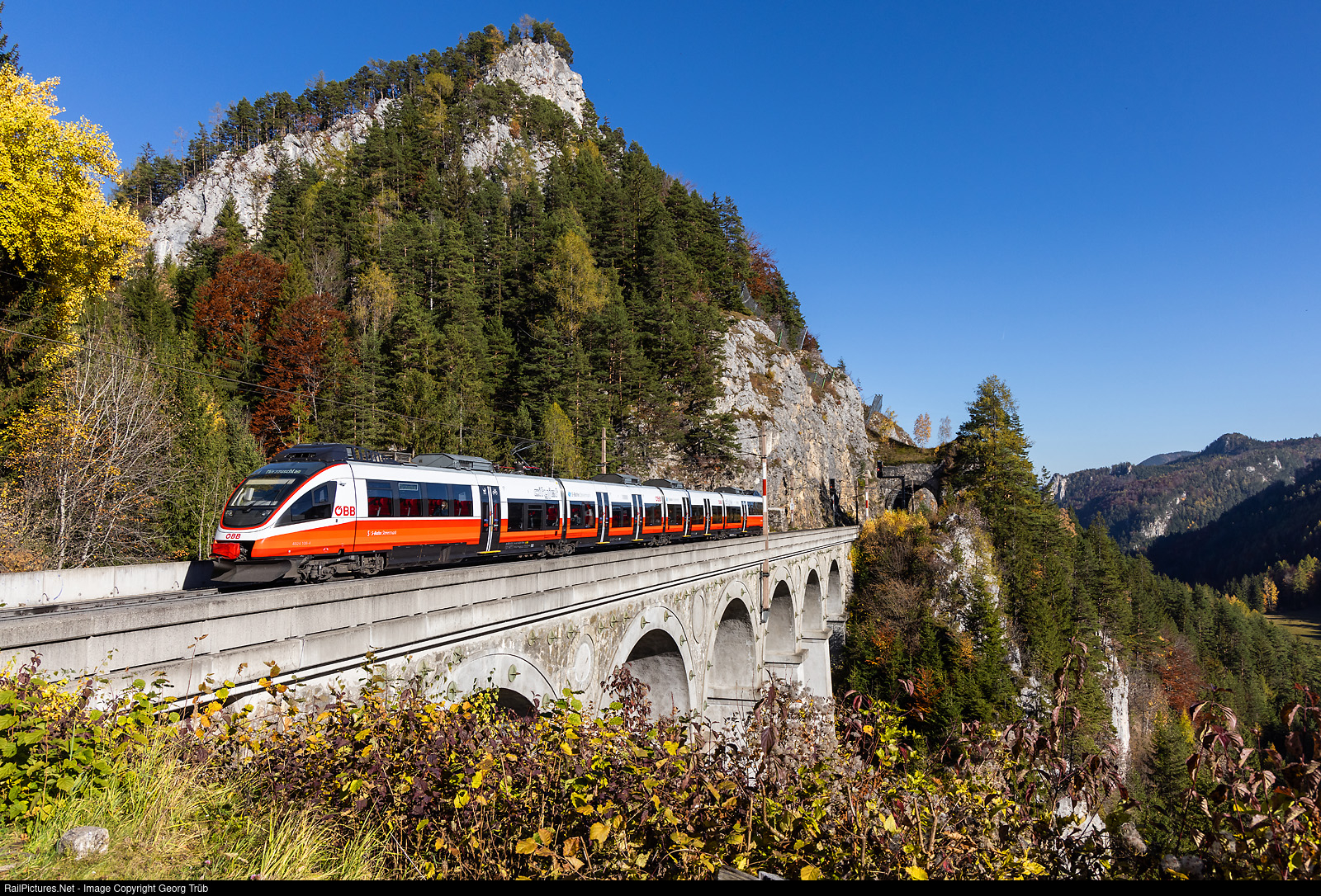 | The passenger service on the Semmering line is run by the S-Bahn Steiermark of the ÖBB. Bombardier "Talent" 4024 # 108, in the refurbished Cityjet-Design, is running train 7535 of the line R 91 from Payerbach-Reichenau to Mürzzuschlag, stopping at all stations, over the Krauselklause viaduct between Breitenstein and Wolfsbergkogel. |