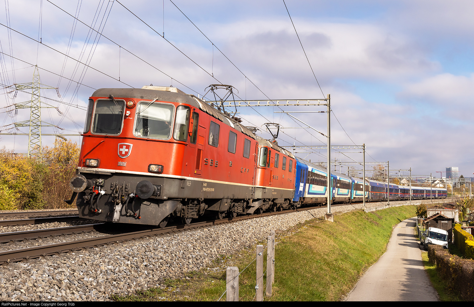 Re 4/4 II # 11139 (Re 420 # 139) of the SBB (first series) and Re 4/4 II # 11301 (Re 420 # 301) of the SBB in multiple control, are pulling the diverted NightJet train 466 from Budapest and Vienna to Zürich, between Winterthur and Winterthur Tössmühle. Because of the line closure (track works) between Feldkirch and Buchs SG, this train was diverted from Feldkirch via Wolfurt-St.Margrethen-St.Gallen-Winterthur-Wallisellen to Zürich. The train has in front 3 cars of the hungarian H-START coming from Budapest (sleeper WLABmz, couchette Bcmz, second class Bmz), then two doubledeck sleeping cars WLBmz and WLABmz, two couchette cars Bcmz, and two second class Bbmvz and Bmz of the austrian state railway ÖBB, coming from Vienna.