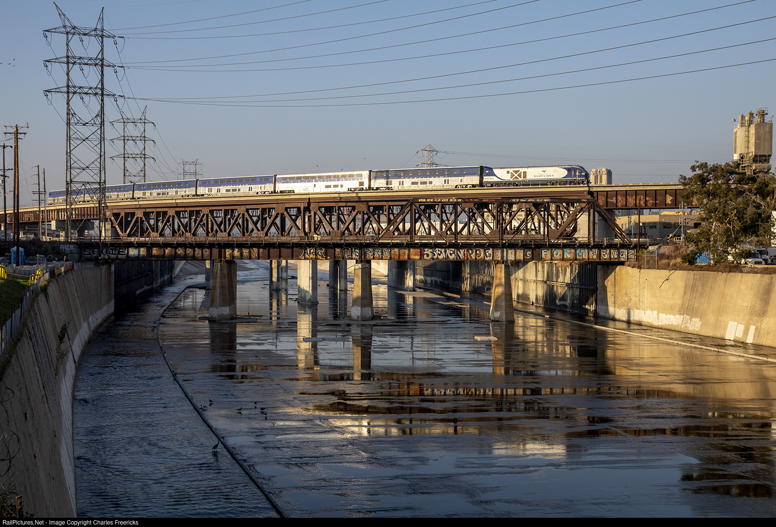 | Amtrak 581 shoves over the Redondo Flyover and the LA River with just a couple miles left to go before reaching Los Angles Union Passenger Station on November 2, 2021. |