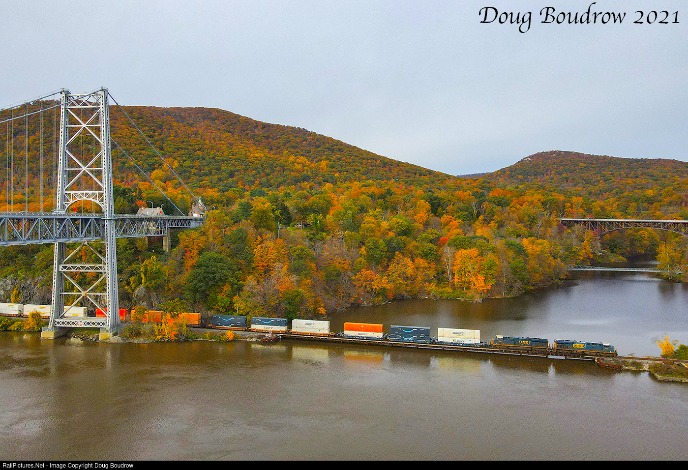 CSX intermodal train I003 is seen hustling North along the River Line at Fort Montgomery. The head-end is on the Popolopen Creek Trestle as the consist passes under the Bear Mountain Bridge.